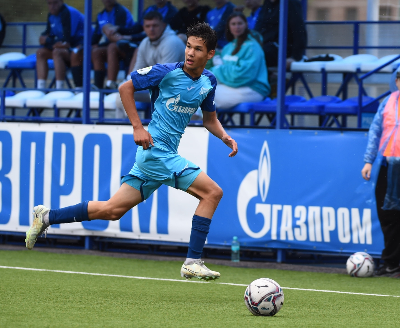 30.09.2023. Россия, Санкт-Петербург, «Газпром»-Академия ФК «Зенит». Юношеская футбольная лига-3, 2023, 9-й тур, «Зенит» U-17 (2008 г.р.) — «Динамо» U-17 (2008 г.р.). На снимке в синей форме: Амир Мусаев, полузащитник ФК «Зенит».Автор: Евгений Васильев / ФК «Зенит»