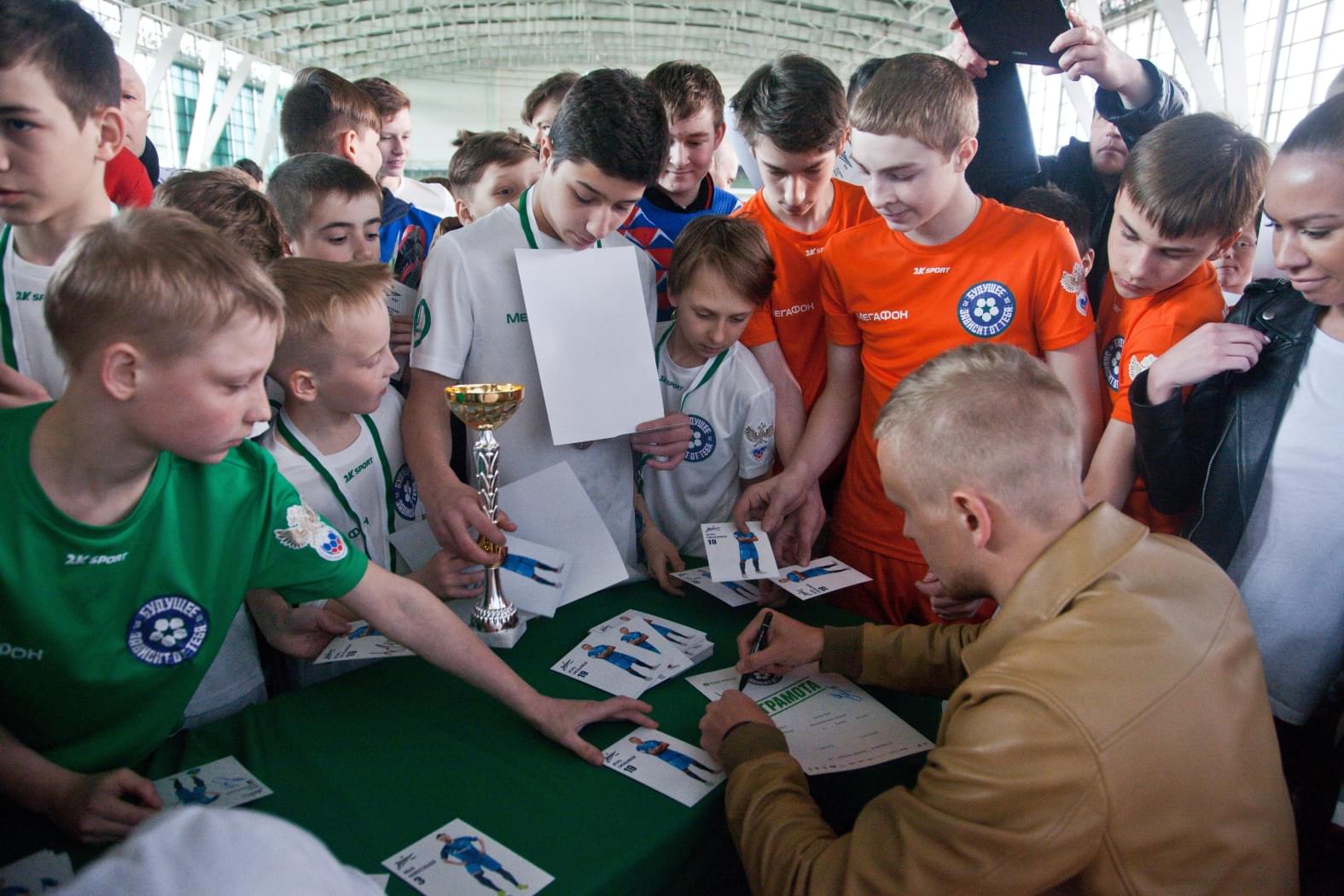 Поддержать всех участников чемпионата во дворец спортивных игр «Зенит» приехали игроки сине-бело-голубых Игорь Смольников и Иван Новосельцев. После церемонии награждения футболисты раздали автографы, сфотографировались и пообщались с ребятами.