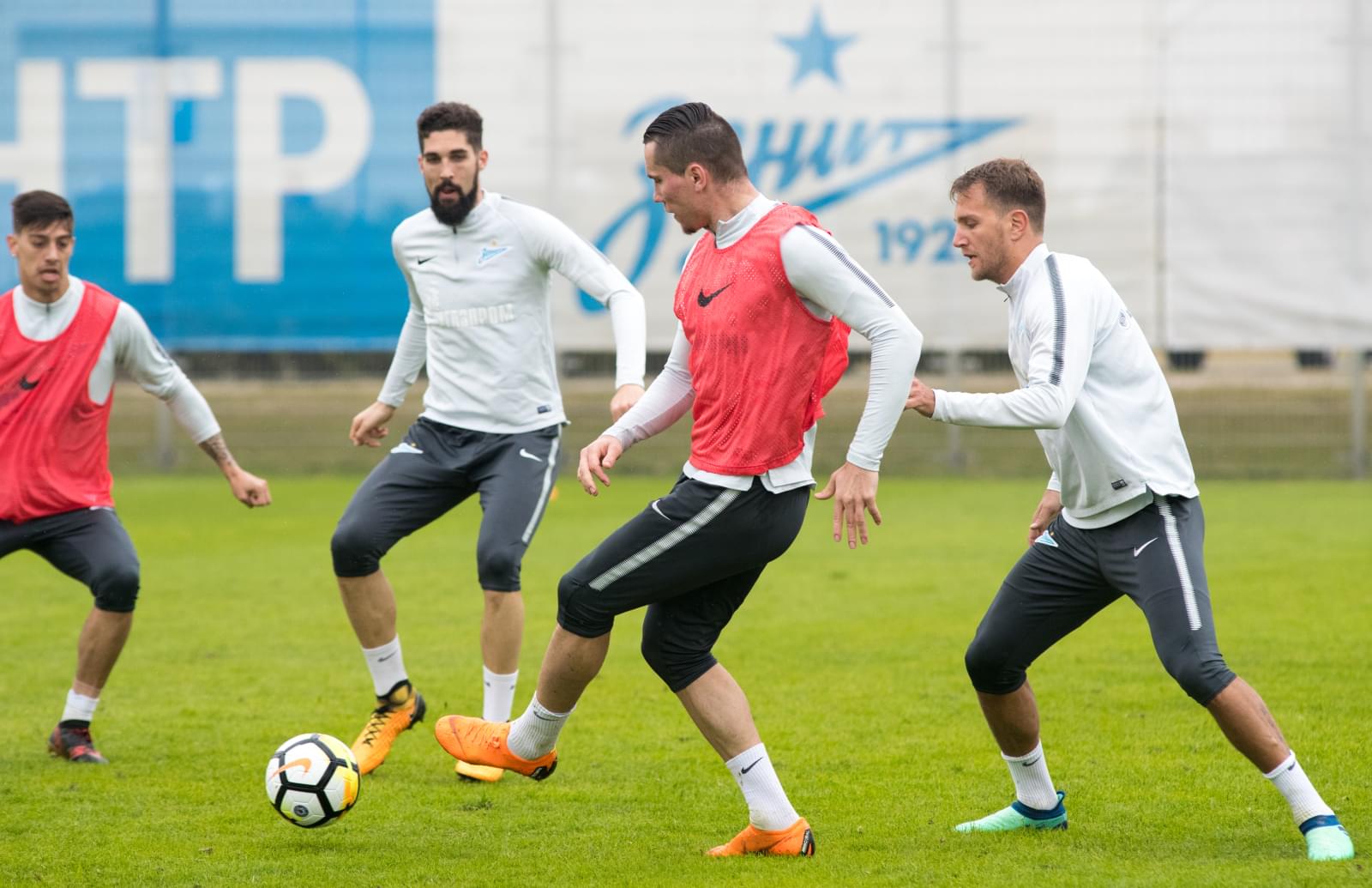 17.04.2018. Россия, Санкт-Петербург, Удельный парк. Тренировка основного состава ФК «Зенит» перед матчем РОСГОССТРАХ-Чемпионата России 2017/18, 23-й тур, «Зенит» — «Динамо». На снимке: Матиас Краневиттер, полузащитник ФК «Зенит», Игорь Смольников, защитник ФК «Зенит», Эльмир Набиуллин, защитник ФК «Зенит», Себастьян Дриусси, нападающий ФК «Зенит», Илья Скроботов, защитник ФК «Зенит», Никита Каккоев, защитник ФК «Зенит».Автор: Вячеслав Евдокимов / ФК «Зенит»
