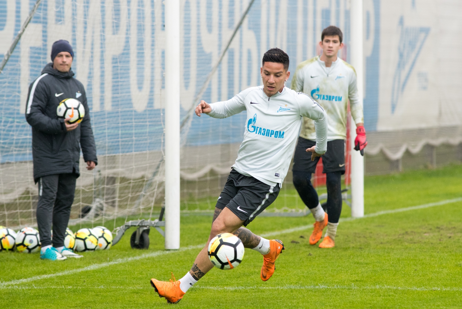 17.04.2018. Россия, Санкт-Петербург, Удельный парк. Тренировка основного состава ФК «Зенит» перед матчем РОСГОССТРАХ-Чемпионата России 2017/18, 23-й тур, «Зенит» — «Динамо». На снимке: Матиас Краневиттер, полузащитник ФК «Зенит», Эмилиано Ригони, полузащитник ФК «Зенит», и Леандро Паредес, полузащитник ФК «Зенит».Автор: Вячеслав Евдокимов / ФК «Зенит»