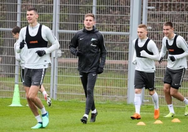 26.04.2018. Россия, Санкт-Петербург, Удельный парк. Тренировка «Зенит»-2 перед матчем ФОНБЕТ-Первенства России по футболу среди команд ФНЛ 2017/18, 35-й тур, «Томь» — «Зенит». На снимке: Вячеслав Зинков, полузащитник ФК «Зенит», Томас Рукас, защитник ФК «Зенит», Владислав Сиротов, нападающий ФК «Зенит», Андрей Панюков, нападающий ФК «Зенит», и Александр Анюков, защитник ФК «Зенит».Автор: Вячеслав Евдокимов / ФК «Зенит»