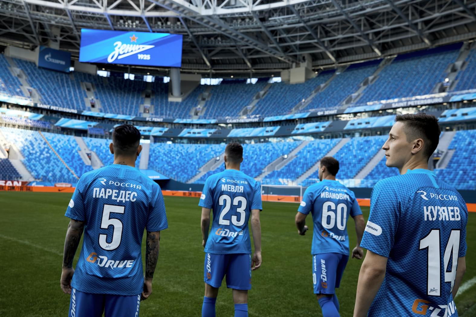 13.05.2018. Санкт-Петербург. Игроки «Зенита» в новой форме от Nike на сезон-2018/19. На снимкеЛеандро Паредес, полузащитник ФК «Зенит», Миха Мевля, защитник ФК «Зенит», Далер Кузяев, полузащитник ФК «Зенит», Бранислав Иванович, защитник ФК «Зенит».Автор: Алексей Костромин / ФК «Зенит»