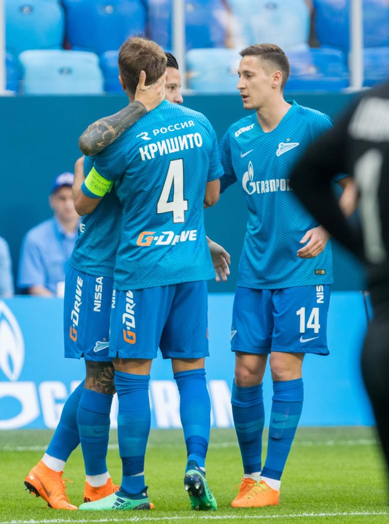 13.05.2018. Россия, Санкт-Петербург, стадион «Санкт-Петербург». РОСГОССТРАХ-Чемпионат России 2017/18, 30-й тур, «Зенит» — «СКА-Хабаровск». На снимке: Антон Заболотный, нападающий ФК «Зенит», Миха Мевля, защитник ФК «Зенит», Александр Ерохин, полузащитник ФК «Зенит», Леандро Паредес, полузащитник ФК «Зенит», и Далер Кузяев, полузащитник ФК «Зенит».Автор: Вячеслав Евдокимов / ФК «Зенит»