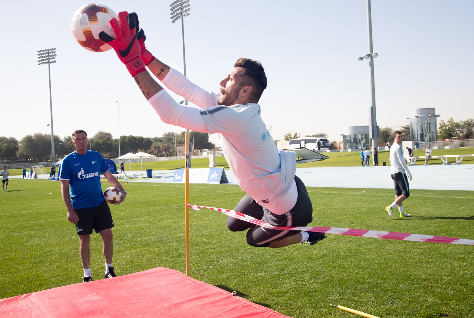 23.01.2018. Объединенные Арабские Эмираты, Дубай. «Газпром» — тренировочные сборы в Дубае: тренировка 23 января. На снимке: Михаил Бирюков, тренер вратарей ФК «Зенит» и Юрий Лодыгин, вратарь ФК «Зенит».Автор: Вячеслав Евдокимов / ФК «Зенит»