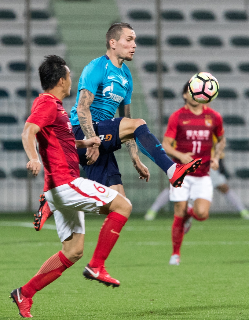 28.01.2018. Объединенные Арабские Эмираты, Дубай, «Мактум ибн Рашид Аль-Мактум». «Газпром»-тренировочные сборы в Дубае: товарищеский матч «Зенит» — «Гуанчжоу Эвергранд». На снимке в синей форме: Антон Заболотный, нападающий ФК «Зенит».Автор: Вячеслав Евдокимов / ФК «Зенит»
