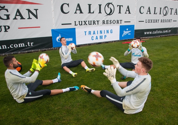 02.02.18. Турция. Вторые зимние «Газпром» — тренировочные сборы в Белеке: первая тренировка. На снимке: Юрий Лодыгин, вратарь ФК «Зенит», Андрей Лунёв, вратарь ФК «Зенит», Егор Бабурин, вратарь ФК «Зенит» и Никита Гойло, вратарь ФК «Зенит».Автор: Вячеслав Евдокимов / ФК «Зенит»
