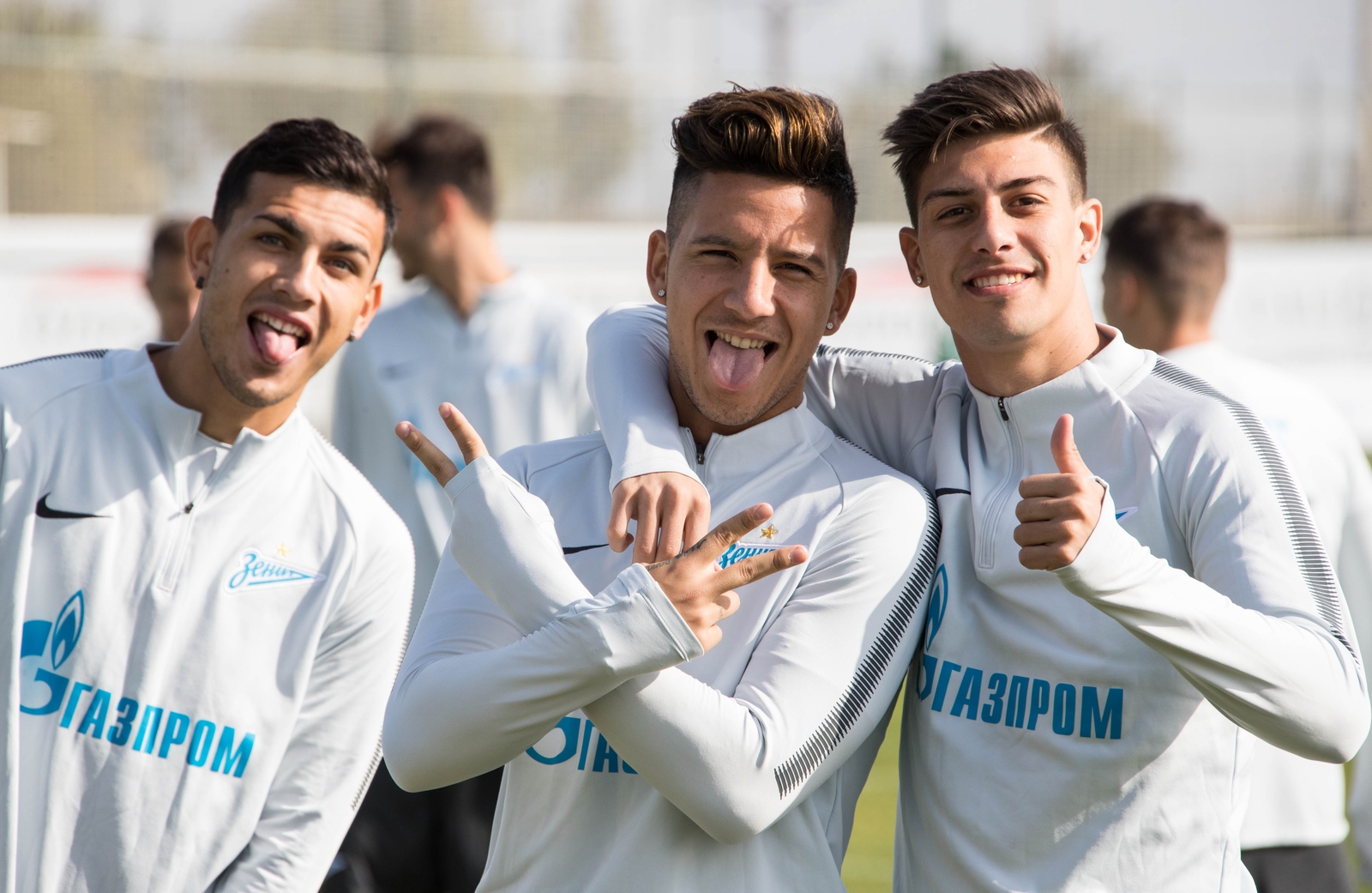 09.02.2018. Турция. Вторые зимние «Газпром» — тренировочные сборы в Белеке: утренняя тренировка. На снимке: Леандро Паредес, полузащитник ФК «Зенит», Себастьян Дриусси, нападающий ФК «Зенит», Эмилиано Ригони, полузащитник ФК «Зенит».Автор: Вячеслав Евдокимов / ФК «Зенит»