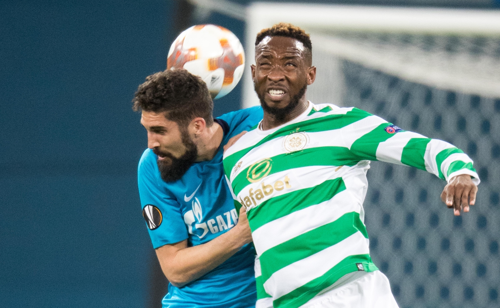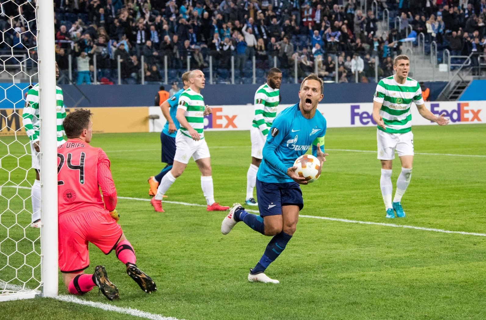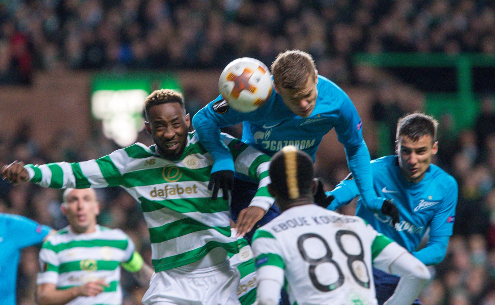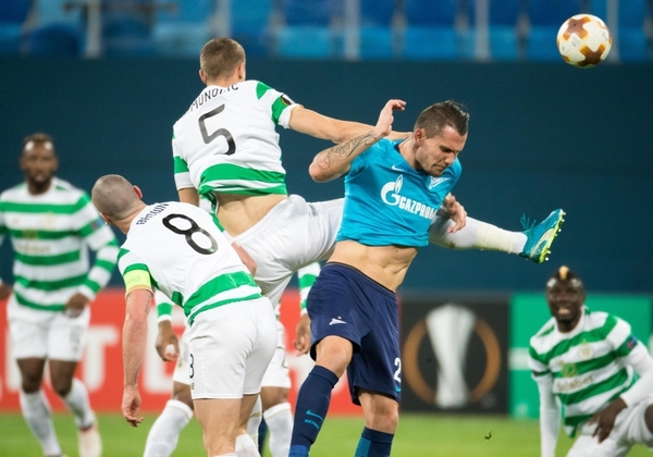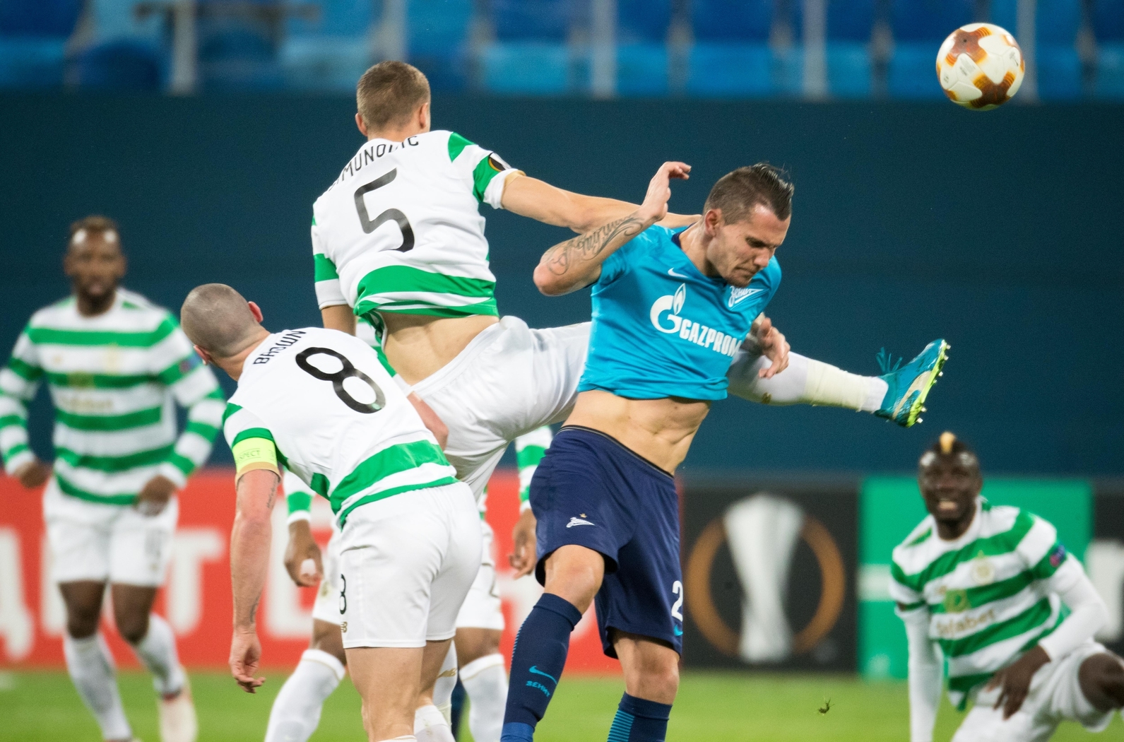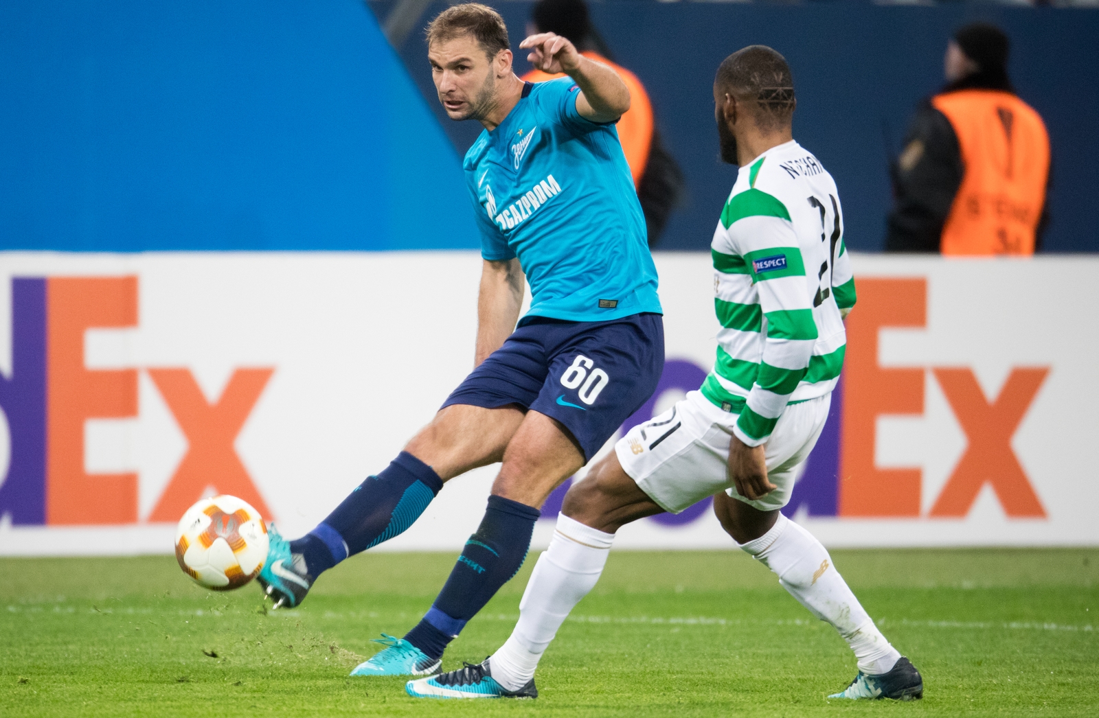 16.02.2018. Великобритания, Глазго, «Селтик Парк». Лига Европы УЕФА 2017/18, «Селтик» — «Зенит». На снимке в синей форме: Александр Кокорин, нападающий ФК «Зенит» и Эмануэль Маммана, защитник ФК «Зенит».Автор: Вячеслав Евдокимов / ФК «Зенит»