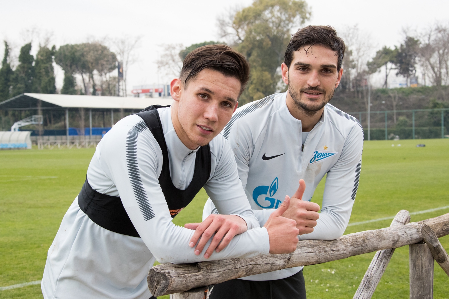 17.02.2018. Италия, Рим, Центр олимпийской подготовки имени Джулио Онести. «Газпром» — тренировочные сборы в Италии: 17 февраля, утренняя тренировка. На снимке: Эльмир Набиуллин, защитник ФК «Зенит» и Магомед Оздоев, полузащитник ФК «Зенит».Автор: Вячеслав Евдокимов / ФК «Зенит»