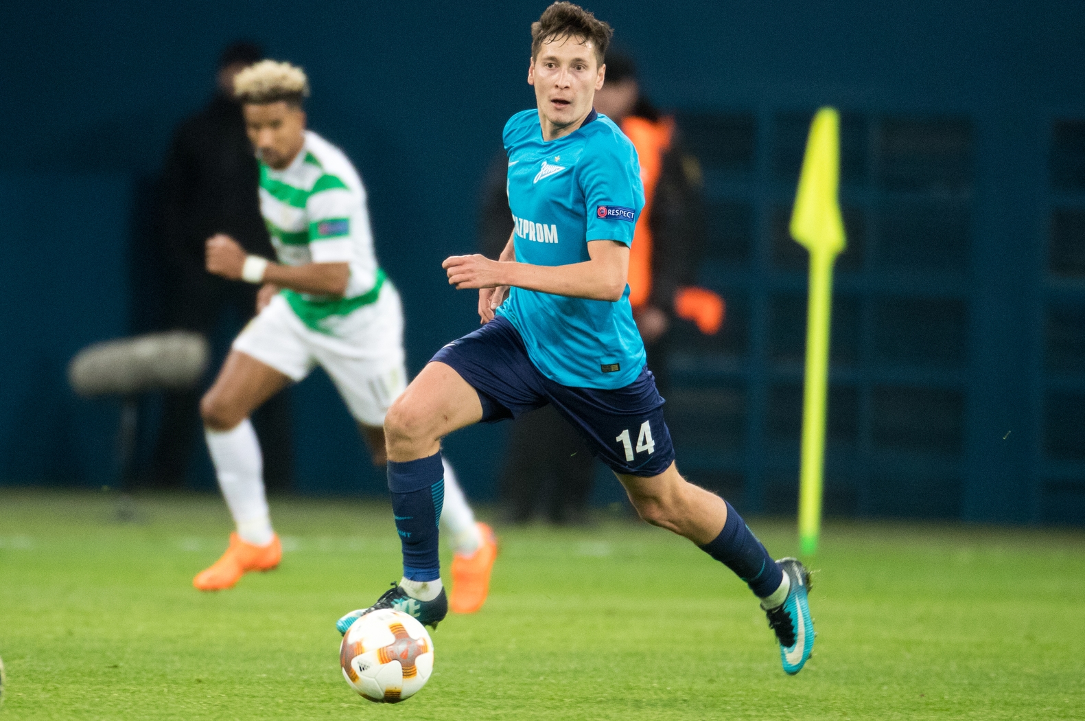 22.02.2018. Россия, Санкт-Петербург, стадион «Санкт-Петербург». Лига Европы УЕФА 2017/18, «Зенит» — «Селтик». На снимке в синей форме: Далер Кузяев, полузащитник ФК «Зенит».Автор: Вячеслав Евдокимов / ФК «Зенит»