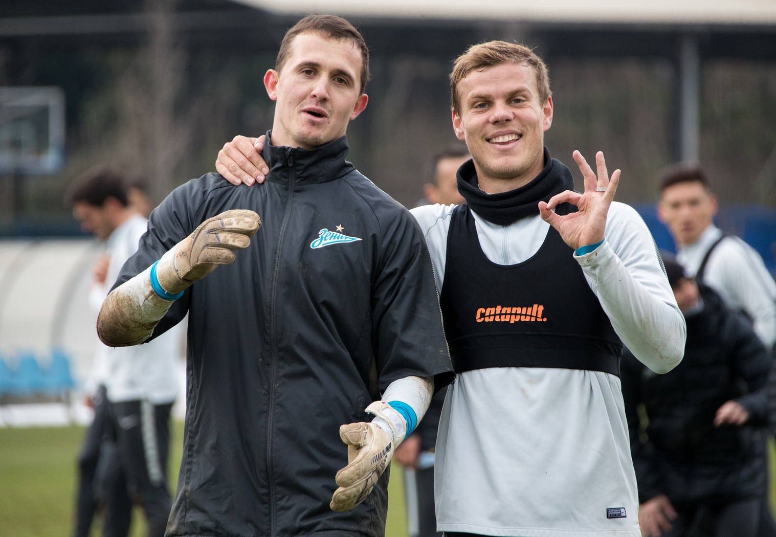 28.02.2018. Италия, Рим. «Газпром» — тренировочные сборы в Италии: 28 февраля, вечерняя тренировка. На снимке: Андрей Лунёв, вратарь ФК «Зенит», и Александр Кокорин, нападающий ФК «Зенит».Автор: Вячеслав Евдокимов / ФК «Зенит»