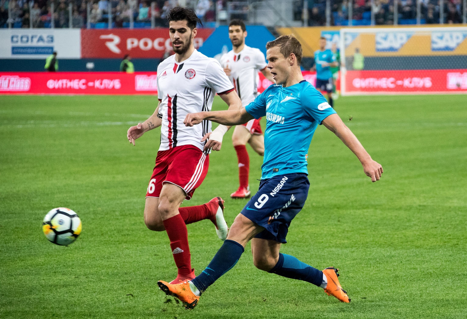 22.01.2018. Объединенные Арабские Эмираты, Дубай, «Мактум ибн Рашид Аль-Мактум». «Газпром» — тренировочные сборы: товарищеский матч «Зенит» — «Копенгаген». На снимке в синей форме: Александр Кокорин, нападающий ФК «Зенит».Автор: Вячеслав Евдокимов / ФК «Зенит»
