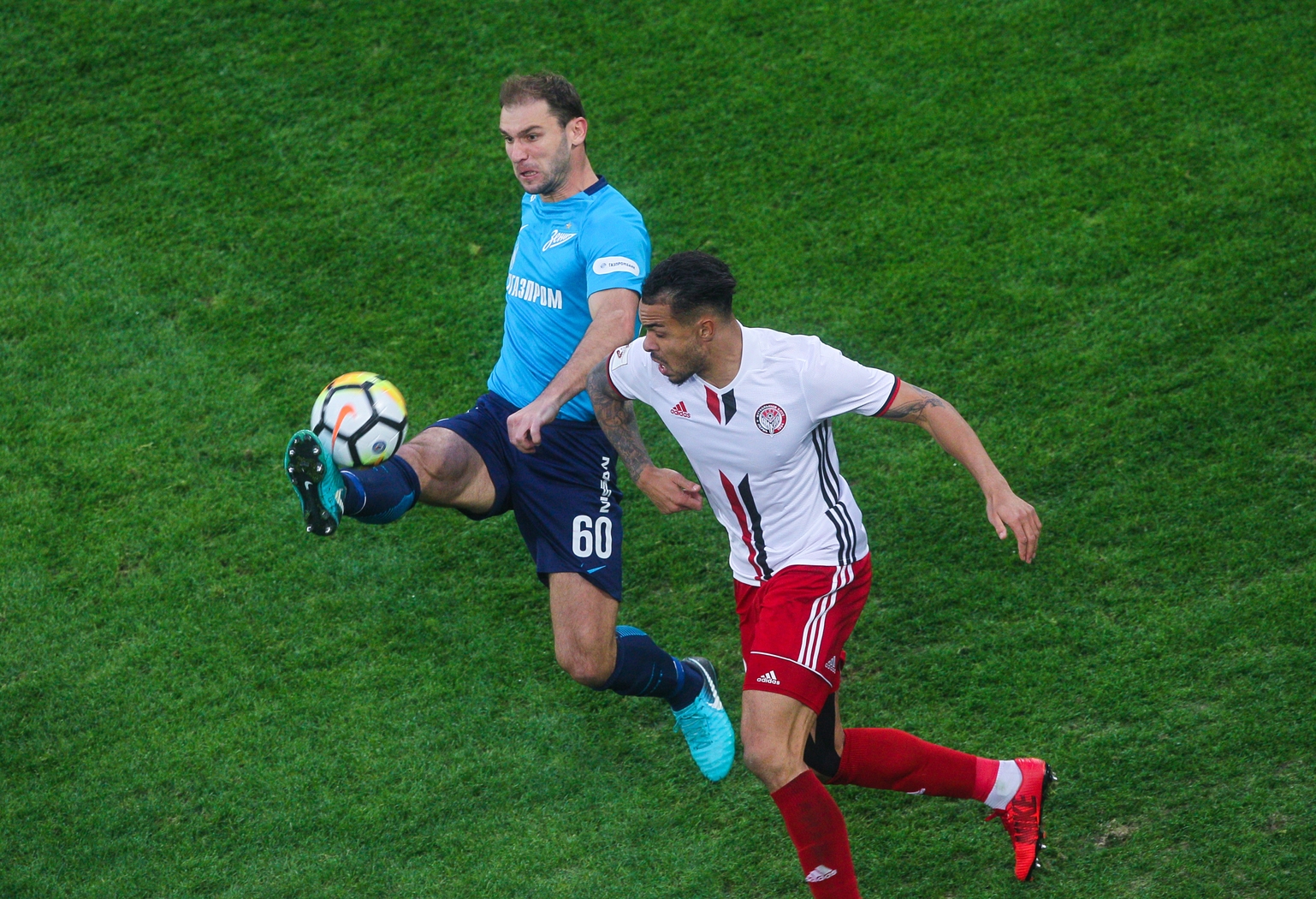 22.02.2018. Россия, Санкт-Петербург, стадион «Санкт-Петербург». Лига Европы УЕФА 2017/18, «Зенит» — «Селтик». На снимке: Бранислав Иванович, защитник ФК «Зенит», Александр Кокорин, нападающий ФК «Зенит».Автор: Вячеслав Евдокимов / ФК «Зенит»