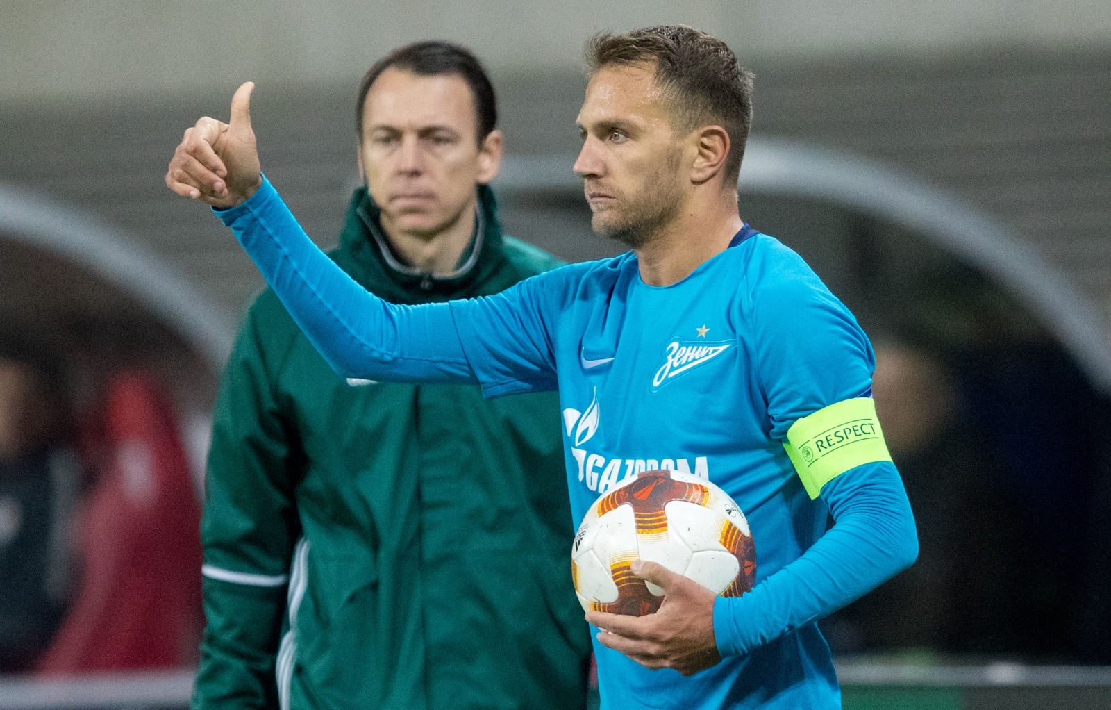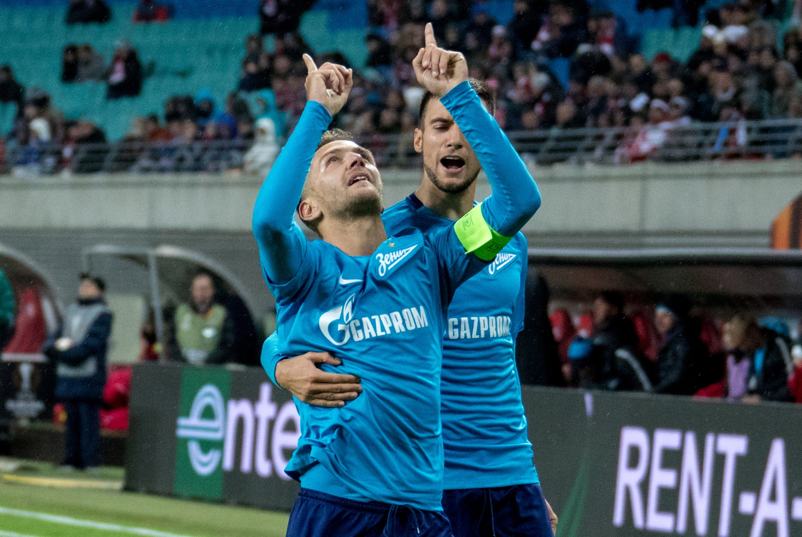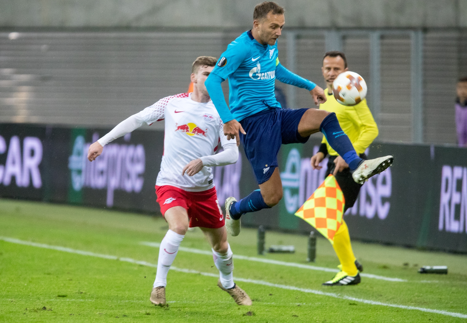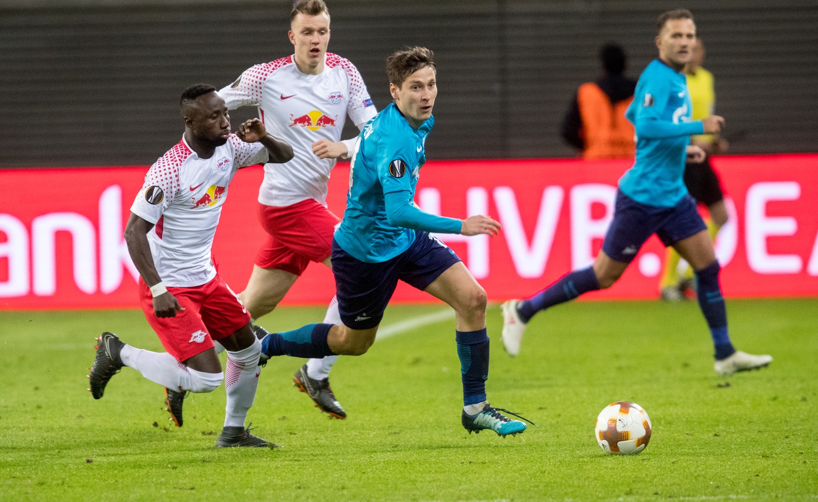 09.03.2018. Германия, Лейпциг, «РБ Арена». Лига Европы УЕФА 2017/18, 1/8 финала, «РБ Лейпциг» — «Зенит». На снимке в синей форме: Далер Кузяев, полузащитник ФК «Зенит» и Доменико Кришито, защитник ФК «Зенит».Автор: Вячеслав Евдокимов / ФК «Зенит»