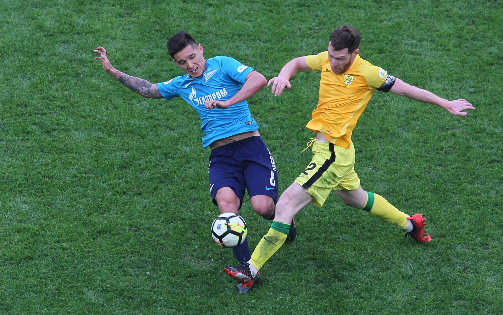 22.04.2018. Россия, Тула, стадион «Арсенал». РОСГОССТРАХ-Чемпионат России 2017/18, 27-й тур, «Арсенал» — «Зенит». На снимке в белой форме: Эмилиано Ригони, полузащитник ФК «Зенит», Далер Кузяев, полузащитник ФК «Зенит».Автор: Вячеслав Евдокимов / ФК «Зенит»