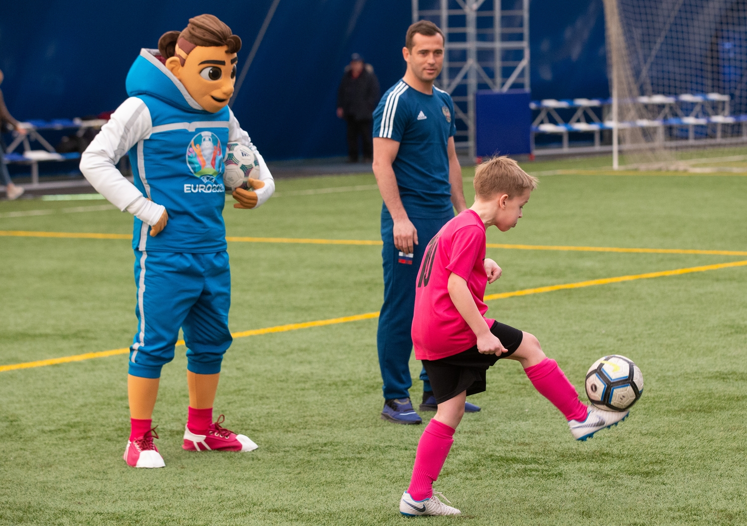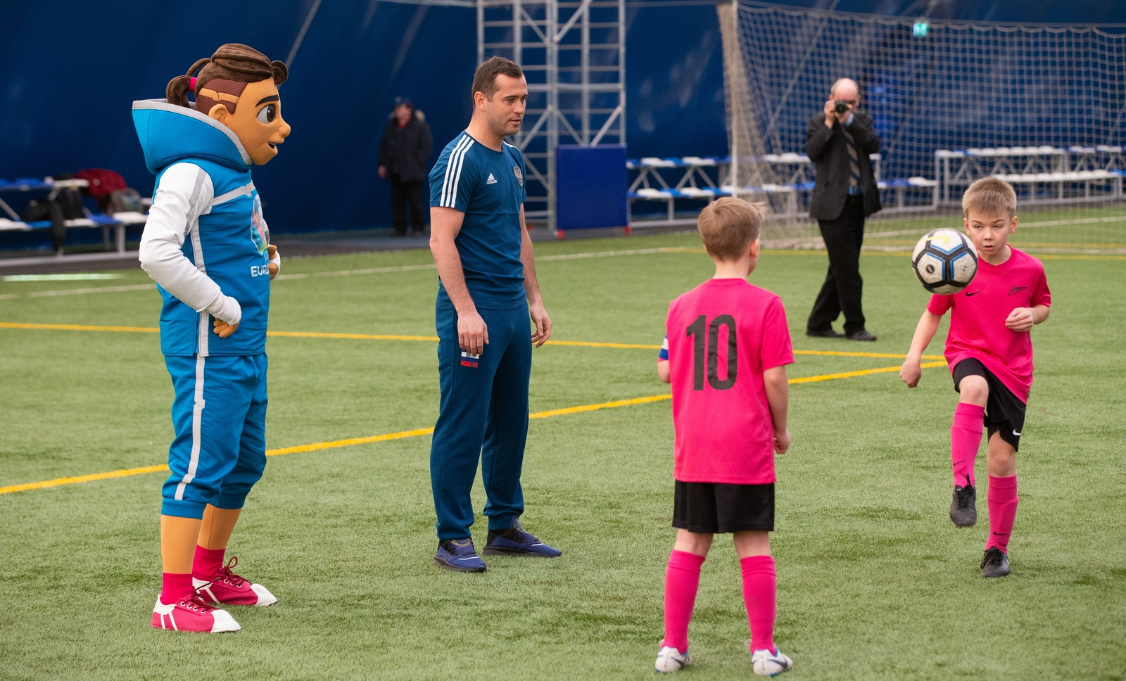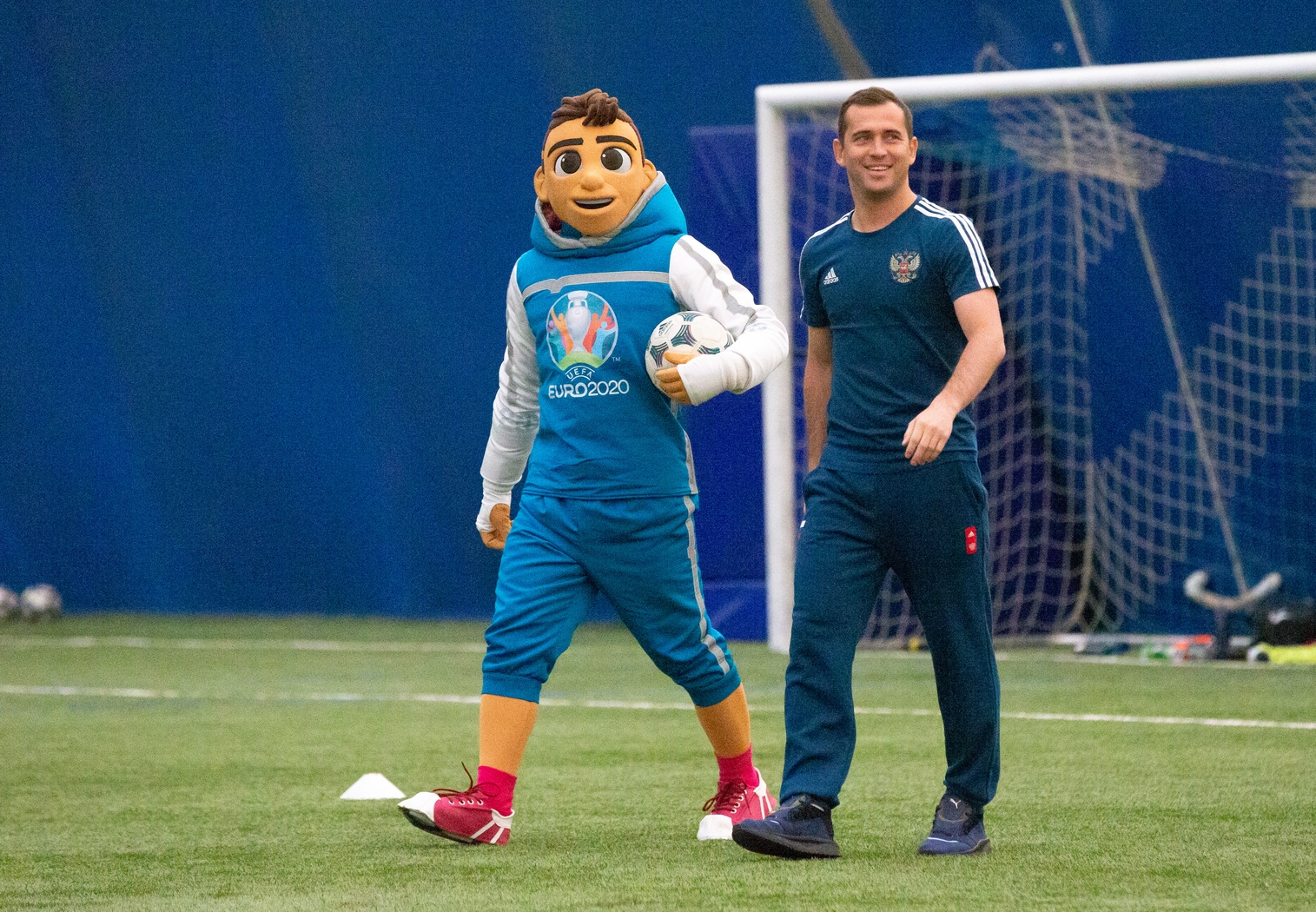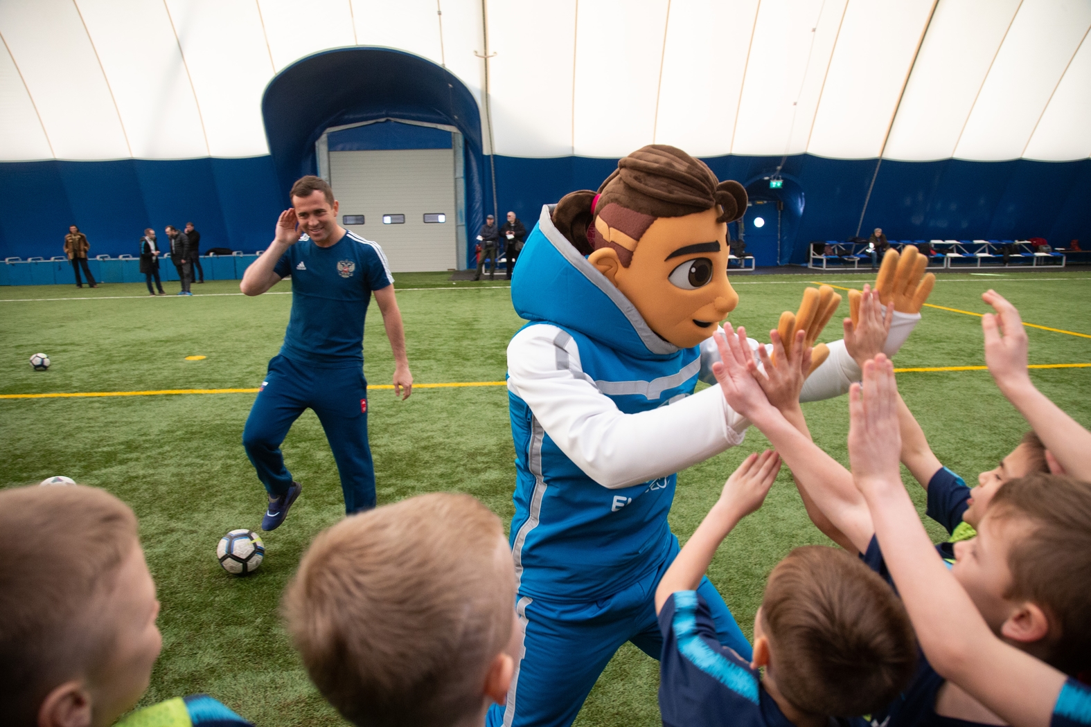 27.03.2019. Россия, Санкт-Петербург. Талисман Евро-2020 «Скиллзи» в сопровождении экс-игрока сине-бело-голубых и сборной России Александра Кержаковова посетили «Газпром»-Академию ФК «Зенит» и провели совместный мастер-класс для ее воспитанников.Автор: Евгений Асмолов / ФК «Зенит»