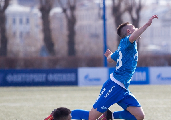 07.04.2019. Россия, Санкт-Петербург, «Петровский», Малая арена. Олимп — Первенство ФНЛ 2018/19, 30-й тур, «Зенит»-2 — «Сибирь». На снимке в синей форме: Михаил Маркин, нападающий ФК «Зенит».Автор: Виктория Ламзина / ФК «Зенит»