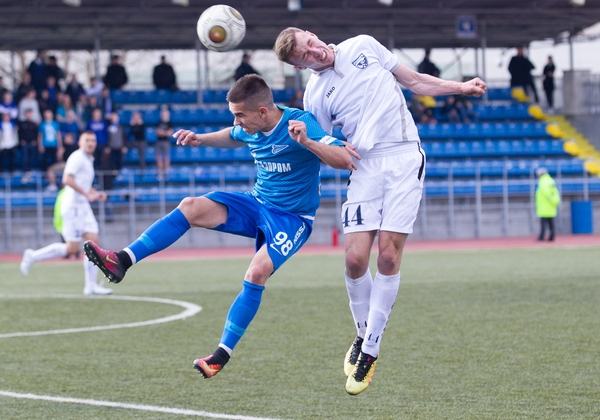 07.04.2019. Россия, Санкт-Петербург, «Петровский», Малая арена. Олимп — Первенство ФНЛ 2018/19, 30-й тур, «Зенит»-2 — «Сибирь». На снимке в синей форме: Дмитрий Богаев, защитник ФК «Зенит», Александр Еловских, нападающий ФК «Зенит».Автор: Виктория Ламзина / ФК «Зенит»