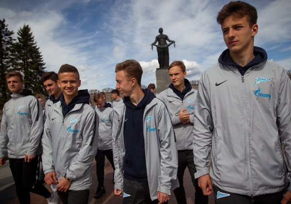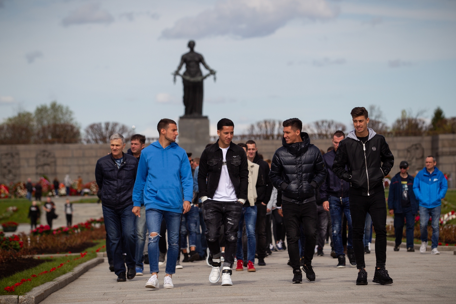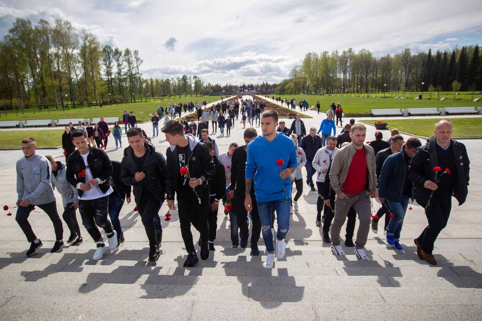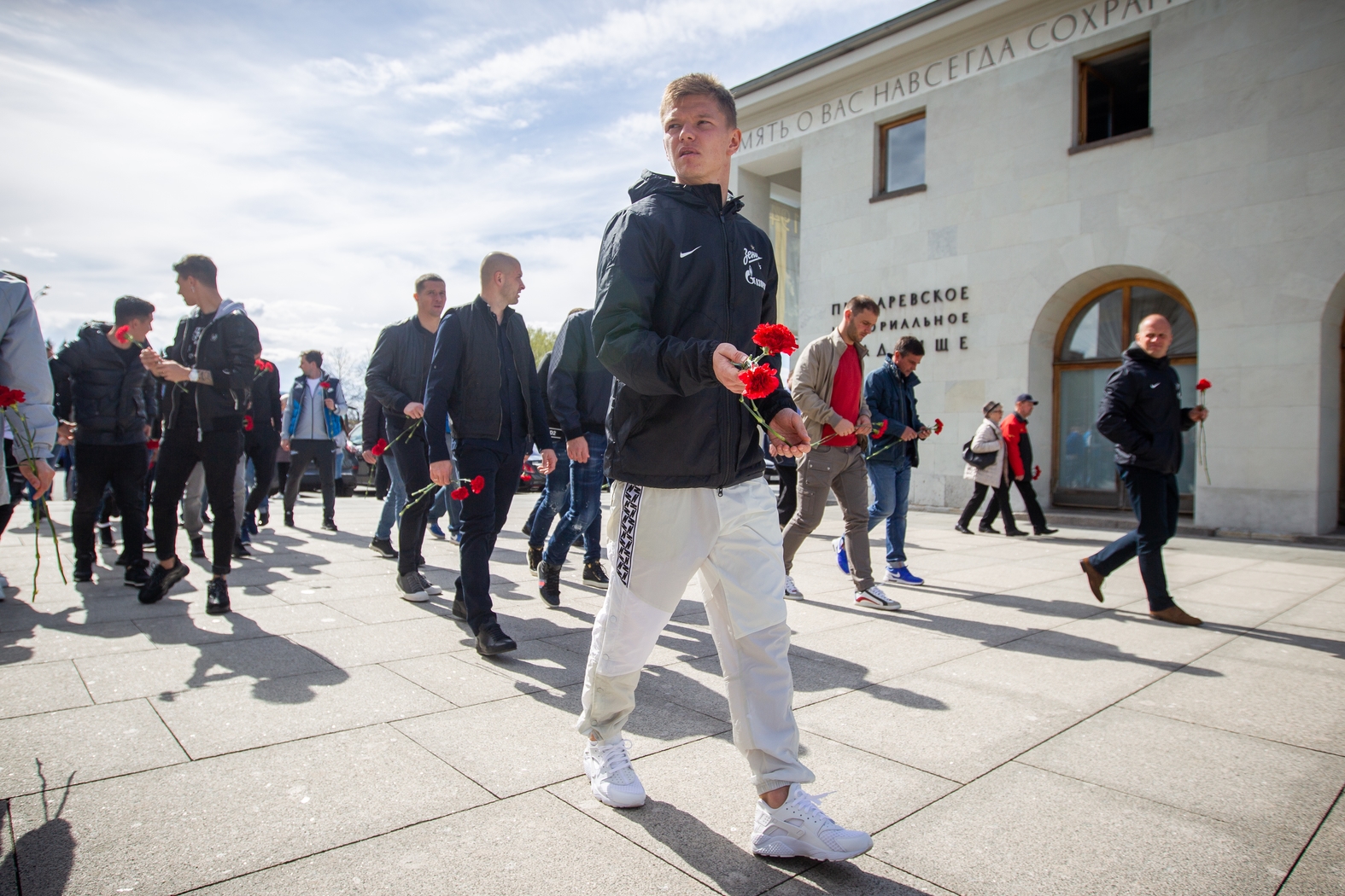 08.05.2019, Россия, Санкт-Петербург. В честь 74-й годовщины Победы в Великой Отечественной войне футболисты, тренерский штаб ФК «Зенит» и воспитанники и руководство «Газпром»-Академии ФК «Зенит» возложили цветы к монументу «Мать-Родина» на Пискаревском мемориальном кладбище.Автор: Виктория Ламзина / ФК «Зенит»