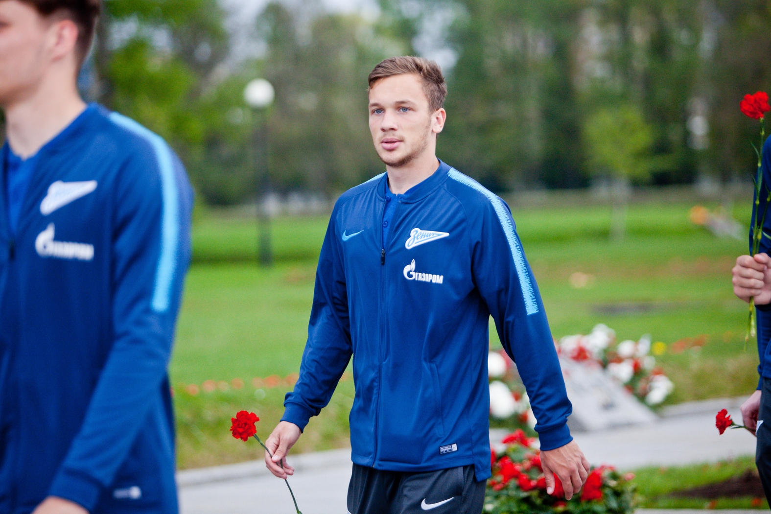 10.05.2019. Россия, Санкт-Петербург, Пискарёвское мемориальное кладбище. Игроки «Зенита»-2 возлагают цветы на Пискаревском мемориальном кладбище. На снимке: Кирилл Капленко, полузащитник ФК «Зенит», Сергей Иванов, полузащитник ФК «Зенит», Томас Рукас, защитник ФК «Зенит».Автор: Анна Мейер / ФК «Зенит»