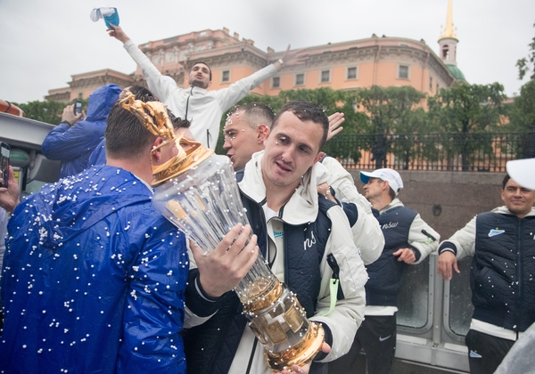 26.05.2019. Россия, Санкт-Петербург. Парад чемпионов после матча Российской Премьер-лиги 2018/19, 30-й тур, «Зенит» — «Енисей». На снимке: Василий Галямин, специалист по аналитике ФК «Зенит», Роберт Мак, полузащитник ФК «Зенит», Андрей Лунёв, вратарь ФК «Зенит», Матиас Краневиттер, полузащитник ФК «Зенит», Александр Ерохин, полузащитник ФК «Зенит», Себастьян Дриусси, нападающий ФК «Зенит», Антон Заболотный, нападающий ФК «Зенит», Магомед Оздоев, полузащитник ФК «Зенит», Кристиан Нобоа, полузащитник ФК «Зенит», Вячеслав Макаров, спикер Законодательного собрания Санкт-Петербург, Александр Беглов, временно исполняющим обязанности Губернатора Санкт-Петербурга, Сергей Семак, главный тренер ФК «Зенит», Александр Анюков, защитник ФК «Зенит», Бранислав Иванович, защитник ФК «Зенит», Ярослав Ракицкий, защитник ФК «Зенит», Эмануэль Маммана, защитник ФК «Зенит», Эмилиано Ригони, полузащитник ФК «Зенит», Луиш Нету, защитник ФК «Зенит», Эрнани, полузащитник ФК «Зенит», Эльмир Набиуллин, защитник ФК «Зенит», Леон Мусаев, полузащитник ФК «Зенит», Игорь Смольников, защитник ФК «Зенит», Михаил Кержаков, вратарь ФК «Зенит», Далер Кузяев, полузащитник ФК «Зенит», Артём Дзюба, нападающий ФК «Зенит», Александр Низелик, тренер ФК «Зенит», Вильям де Оливейра, тренер ФК «Зенит», Мария Бурова, тренер по физической подготовке ФК «Зенит», Анатолий Тимощук, тренер ФК «Зенит», Юрий Жевнов, тренер вратарей ФК «Зенит», Андреа Сканавино, тренер по физподготовке ФК «Зенит».Автор: Михаил Разуваев / ФК «Зенит»- Александр Анюков