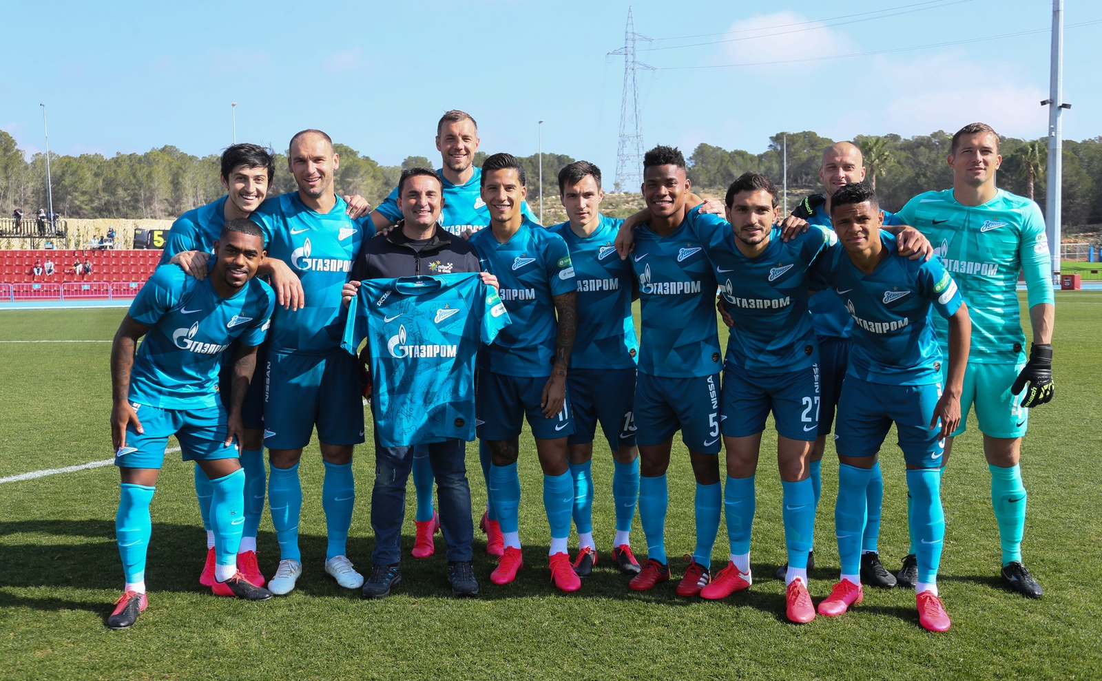 09.02.2020. Испания, Ла Нусия, «Камило Кано». «Газпром»-тренировочные сборы в Испании: Товарищеский матч «Зенит» — ЦСКА. На снимке в синей форме: Сердар Азмун, нападающий ФК «Зенит», Малком, полузащитник ФК «Зенит», Бранислав Иванович, защитник ФК «Зенит», Артём Дзюба, нападающий ФК «Зенит», Себастьян Дриусси, нападающий ФК «Зенит», Вячеслав Караваев, защитник ФК «Зенит», Вильмар Барриос, полузащитник ФК «Зенит», Магомед Оздоев, полузащитник ФК «Зенит», Ярослав Ракицкий, защитник ФК «Зенит», Дуглас Сантос, защитник ФК «Зенит», и Михаил Кержаков, вратарь ФК «Зенит» (в бирюзовой форме).Автор: Вячеслав Евдокимов / ФК «Зенит»