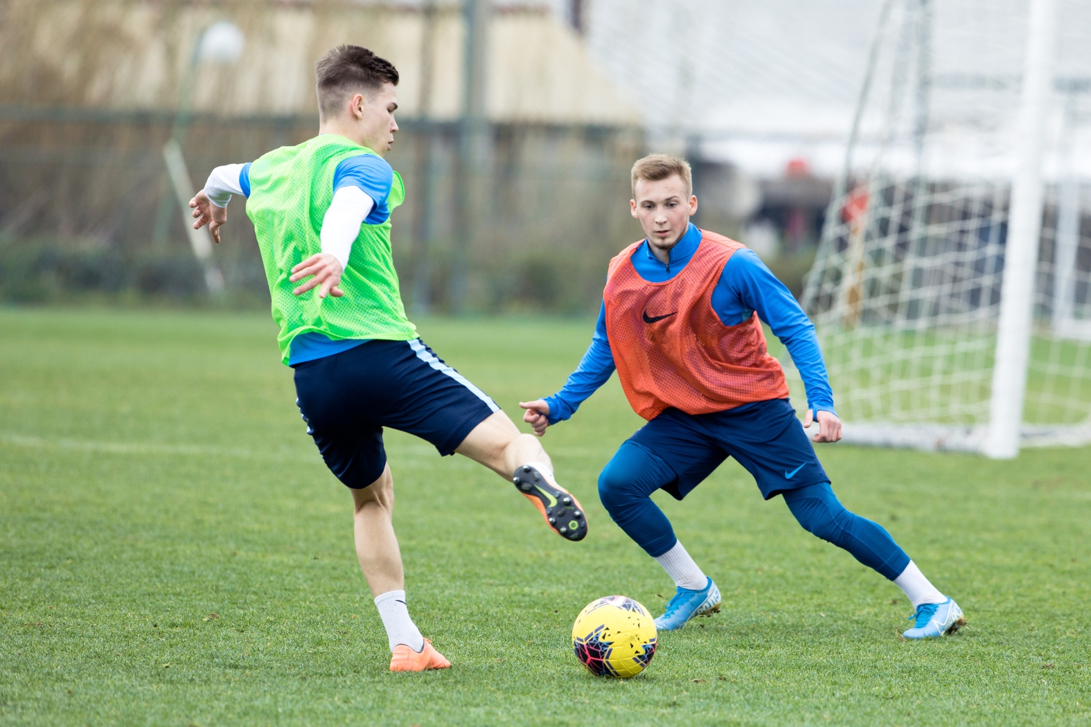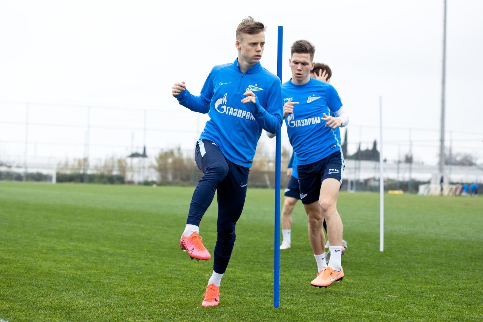 13.02.2020. Турция, Анталья. Второй зимний сбор «Зенита»-м в Турции: 13 февраля, утренняя тренировка. На снимке: Иван Коршунов, нападающий ФК «Зенит», Данила Хотулев, защитник ФК «Зенит».Автор: Анна Мейер / ФК «Зенит»