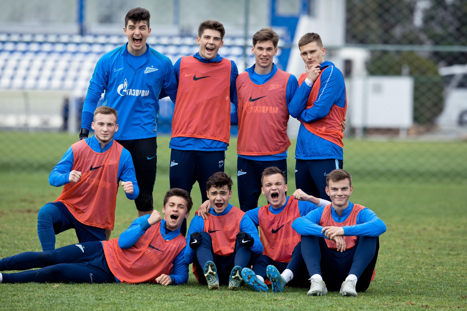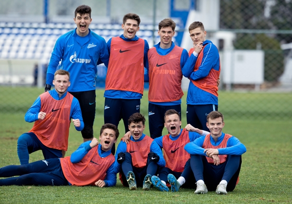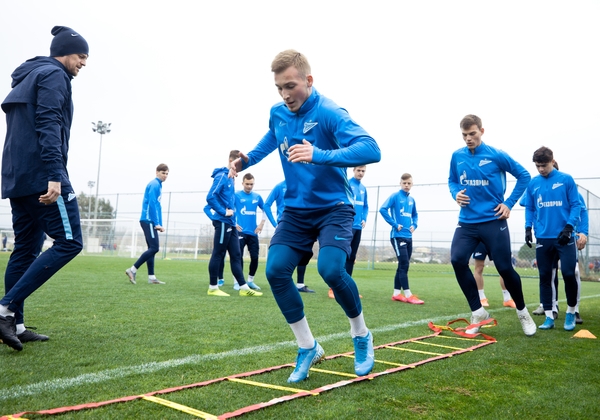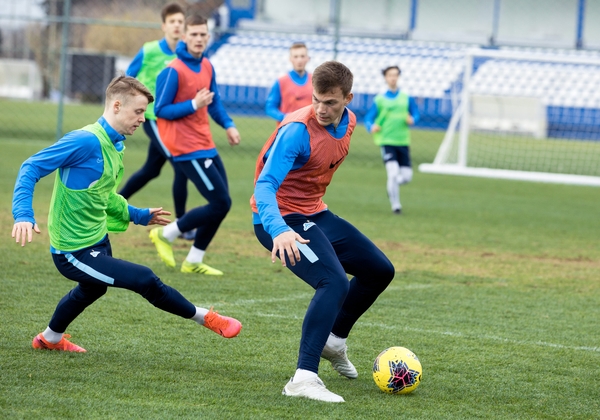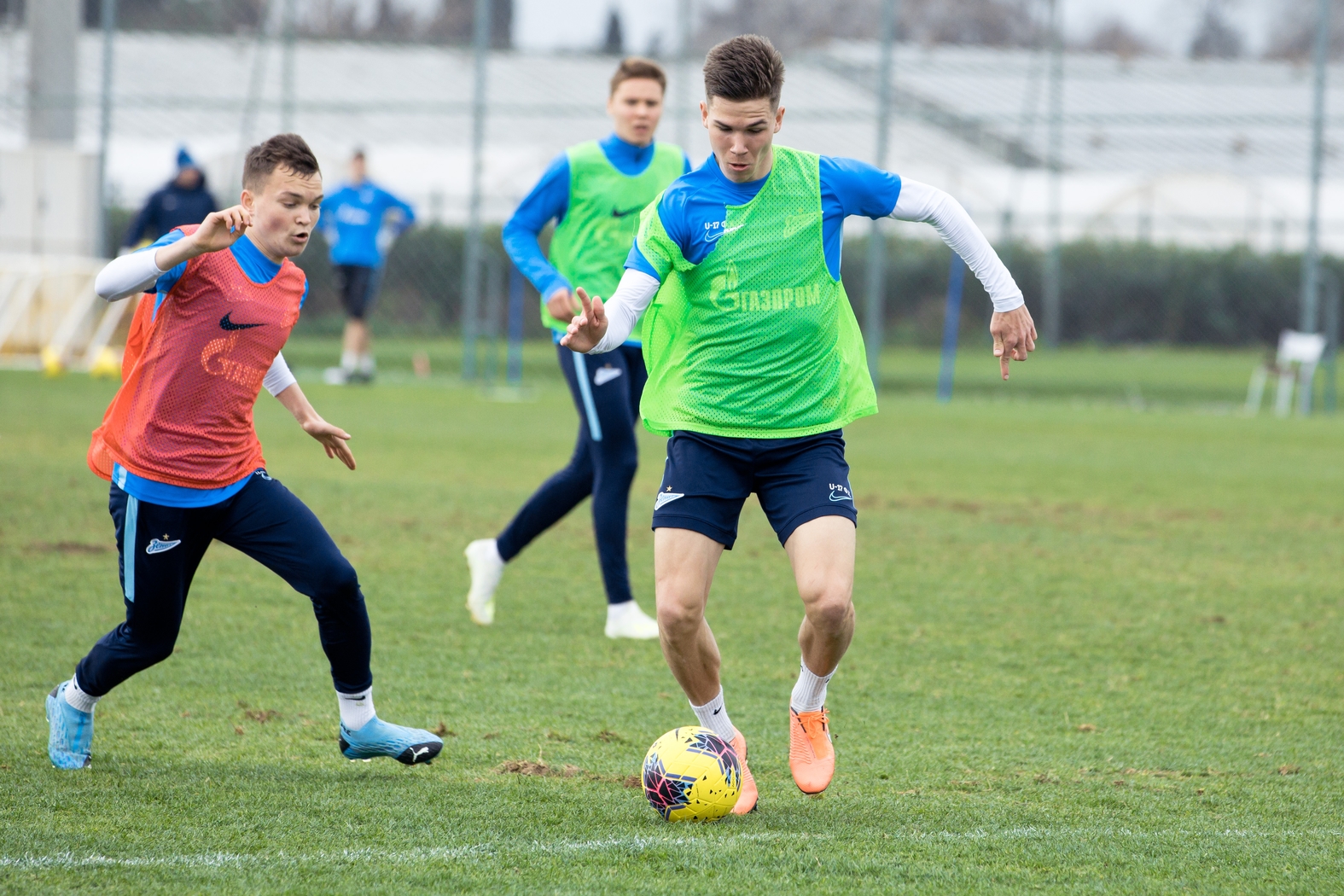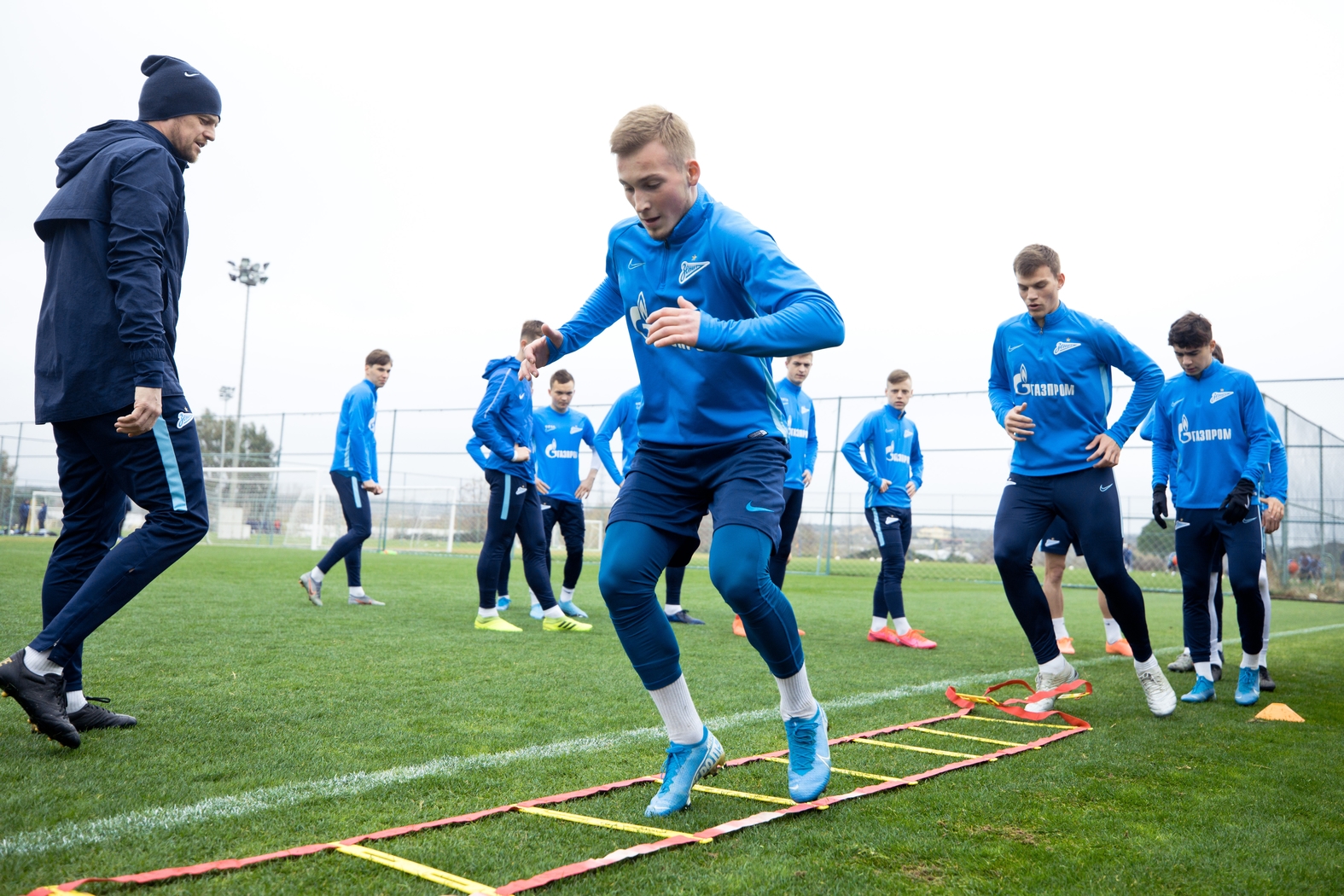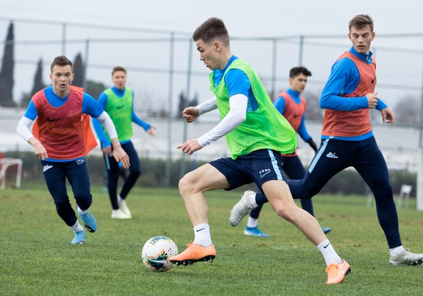 13.02.2020. Турция, Анталья. Второй зимний сбор «Зенита»-м в Турции: 13 февраля, утренняя тренировка. На снимке: Владислав Баконин, вратарь ФК «Зенит», Антон Бугорский, полузащитник ФК «Зенит», Роман Ногтев, нападающий ФК «Зенит», Данила Варичев, защитник ФК «Зенит», Максим Смирнов, защитник ФК «Зенит», Кирилл Щетинин, полузащитник ФК «Зенит», Георгий Каргинов, полузащитник ФК «Зенит», Александр Болдырев, полузащитник ФК «Зенит», Данила Хотулев, защитник ФК «Зенит».Автор: Анна Мейер / ФК «Зенит»