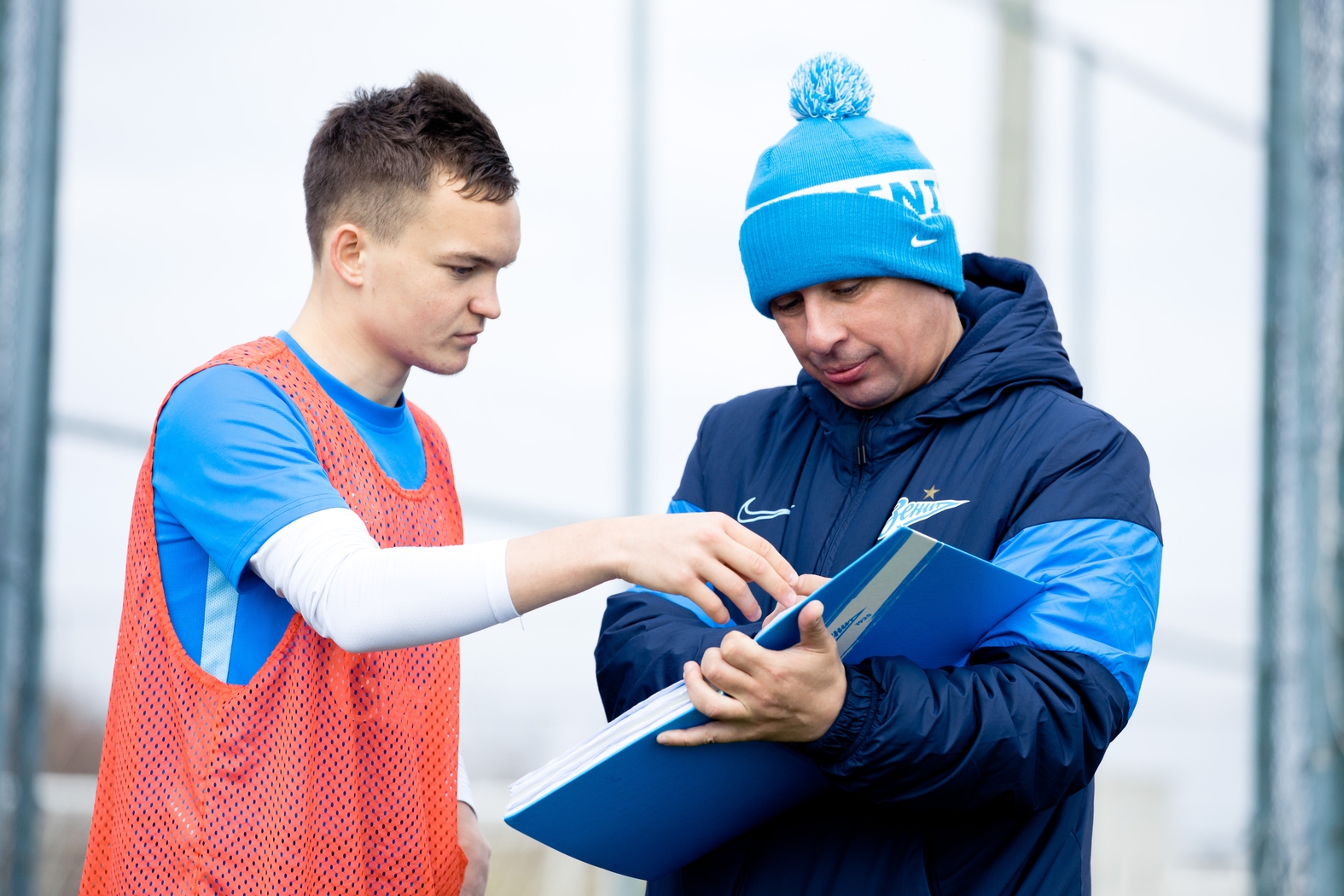 13.02.2020. Турция, Анталья. Второй зимний сбор «Зенита»-м в Турции: 13 февраля, утренняя тренировка. На снимке: Александр Болдырев, полузащитник ФК «Зенит», Анвер Конеев, тренер ФК «Зенит».Автор: Анна Мейер / ФК «Зенит»
