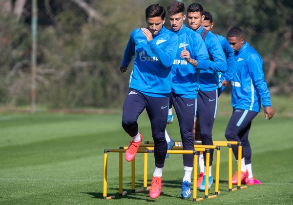 16.02.2020. Турция, Анталья. «Газпром»-тренировочные сборы в Турции: 16 февраля, утренняя тренировка. На снимке: Эмилиано Ригони, полузащитник ФК «Зенит», Йордан Осорио, защитник ФК «Зенит», Себастьян Дриусси, нападающий ФК «Зенит», Юрий Жирков, защитник ФК «Зенит», и Малком, полузащитник ФК «Зенит».Автор: Вячеслав Евдокимов / ФК «Зенит»