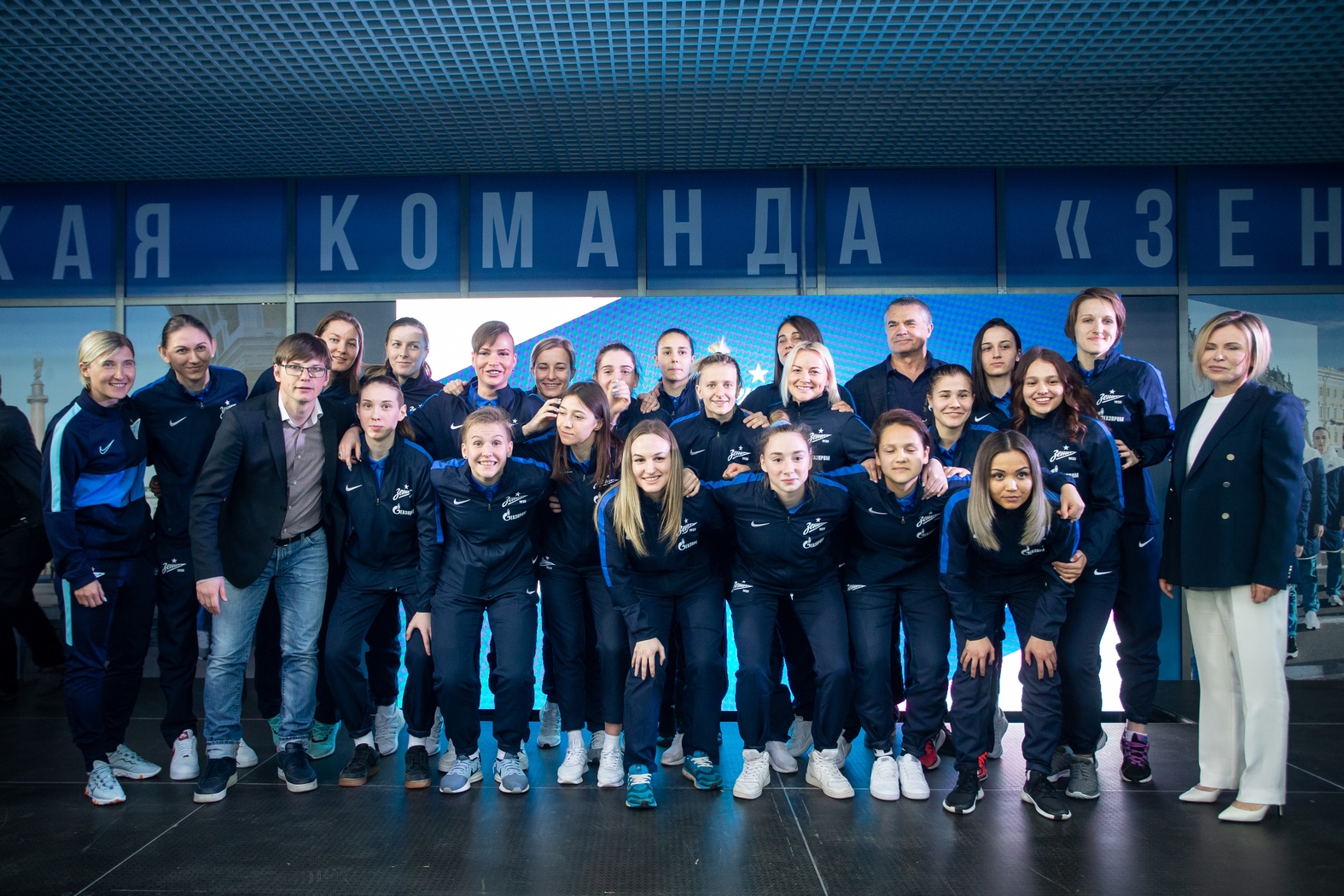 09.03.2020, Россия, Санкт-Петербург, «Газпром Арена». Презентация ЖФК «Зенит» на Фан-Променаде. На снимке: Зарина Шарифова, полузащитник ЖФК «Зенит», Ксения Батова, нападающий ЖФК «Зенит», Аида Гайстенова, полузащитник ЖФК «Зенит», Полина Тыртышева, полузащитник ЖФК «Зенит», Татьяна Морина, нападающий ЖФК «Зенит», Ольга Порядина, главный тренер женской футбольной команды «Зенит».Автор: Евгений Асмолов / ФК «Зенит»