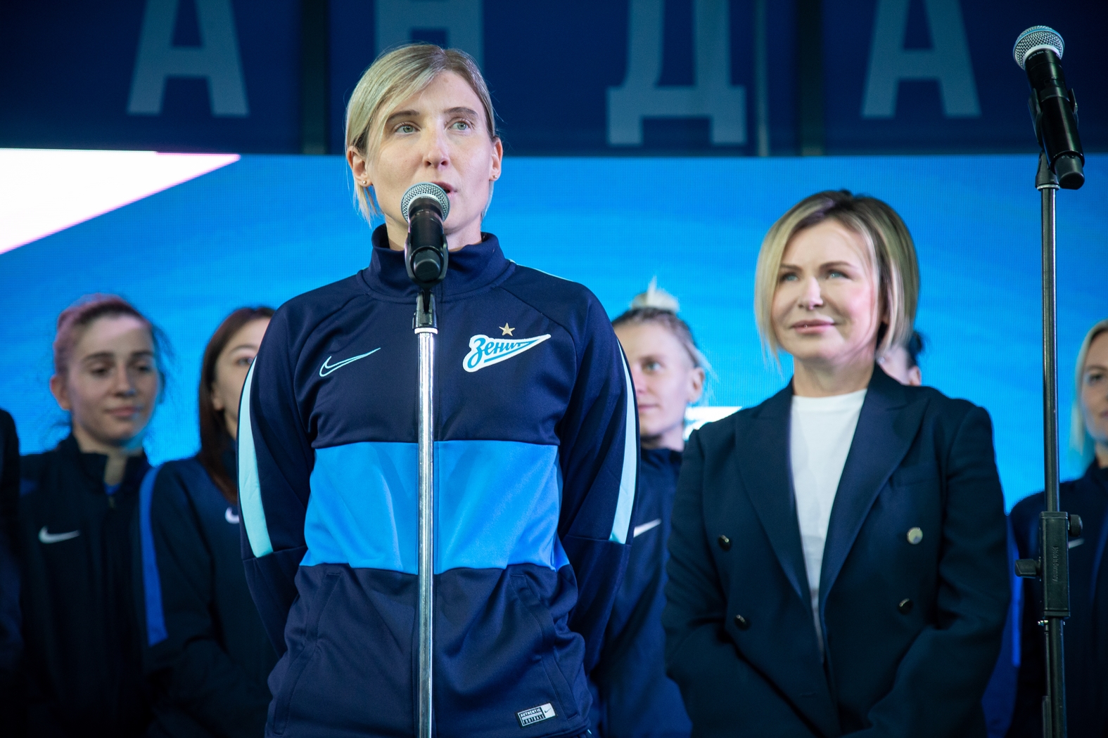 09.03.2020, Россия, Санкт-Петербург, «Газпром Арена». Презентация ЖФК «Зенит» на Фан-Променаде. На снимке: Ольга Порядина, главный тренер женской футбольной команды «Зенит», Елена Илюхина, Председатель совета директоров ФК «Зенит».Автор: Евгений Асмолов / ФК «Зенит»