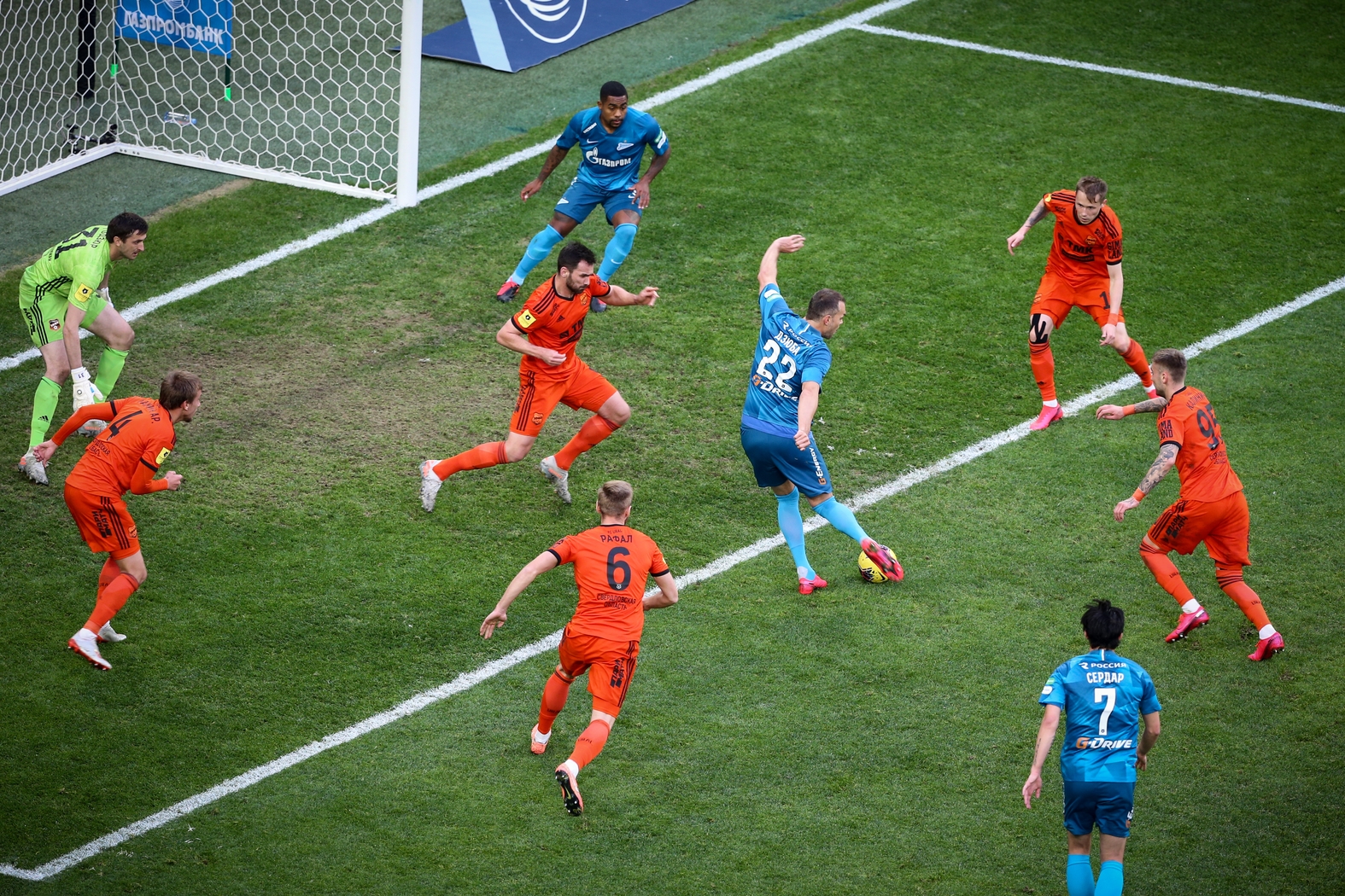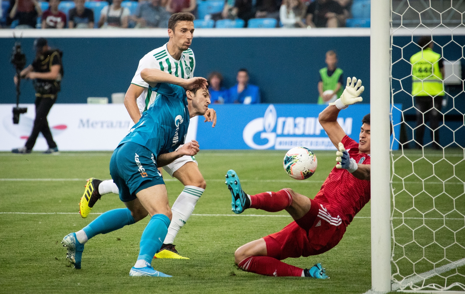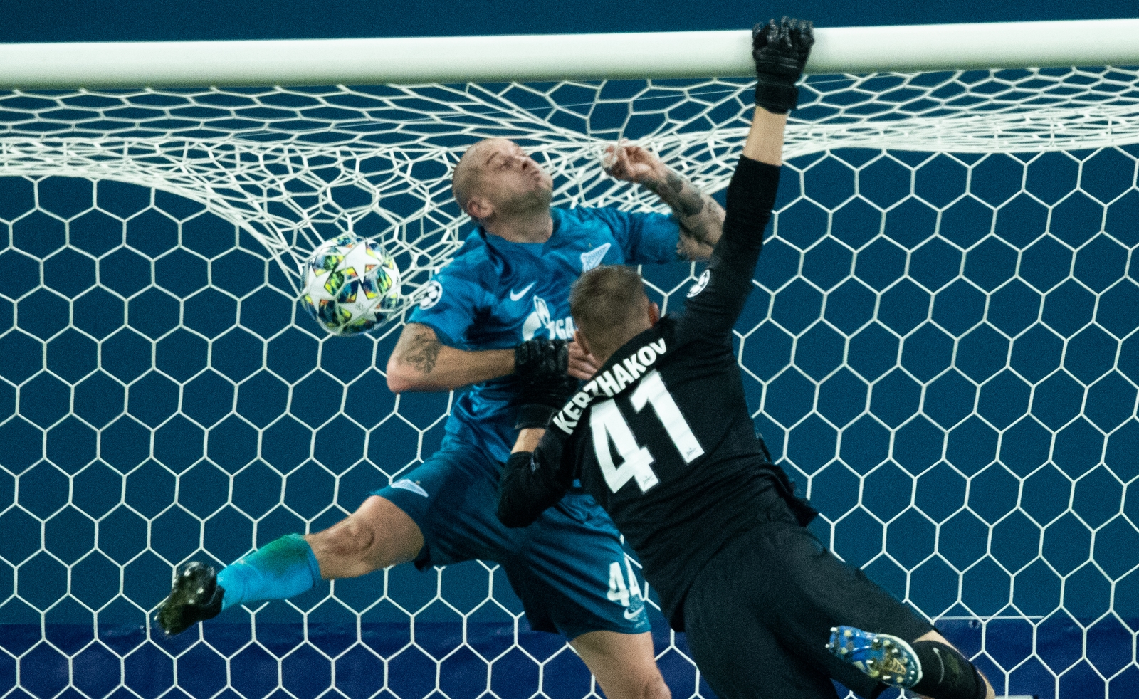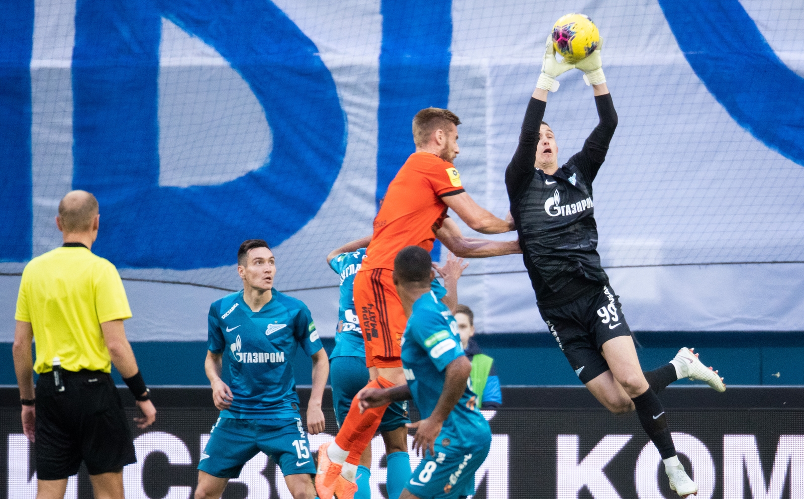 14.03.2020. Россия, Санкт-Петербург, «Газпром Арена». ТИНЬКОФФ Российская Премьер-Лига 2019/20, 22-й тур, «Зенит» — «Урал». На снимке в синей форме у ворот голкипера «Зенита» Андрея Лунева (в черной форме): Вячеслав Караваев, защитник ФК «Зенит», Малком, полузащитник ФК «Зенит».Автор: Вячеслав Евдокимов / ФК «Зенит»