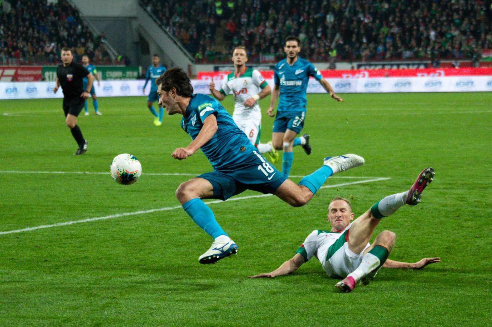 28.09.2019. Россия, Москва, «РЖД Арена». Российская Премьер-Лига 2019/20, 11-й тур, «Локомотив» — «Зенит». На снимке в синей форме: Юрий Жирков, защитник ФК «Зенит».Автор: Вячеслав Евдокимов / ФК «Зенит»