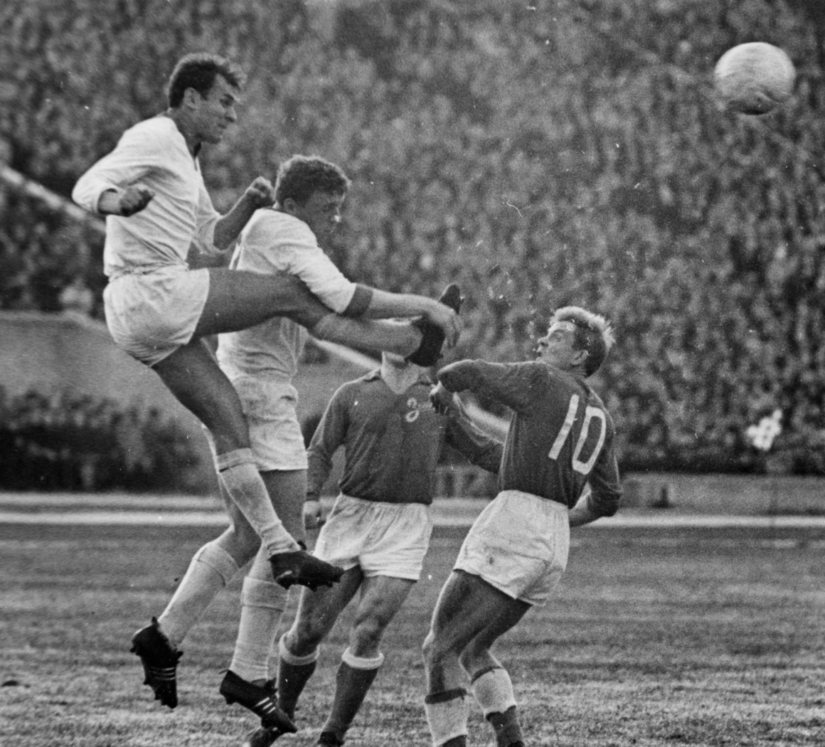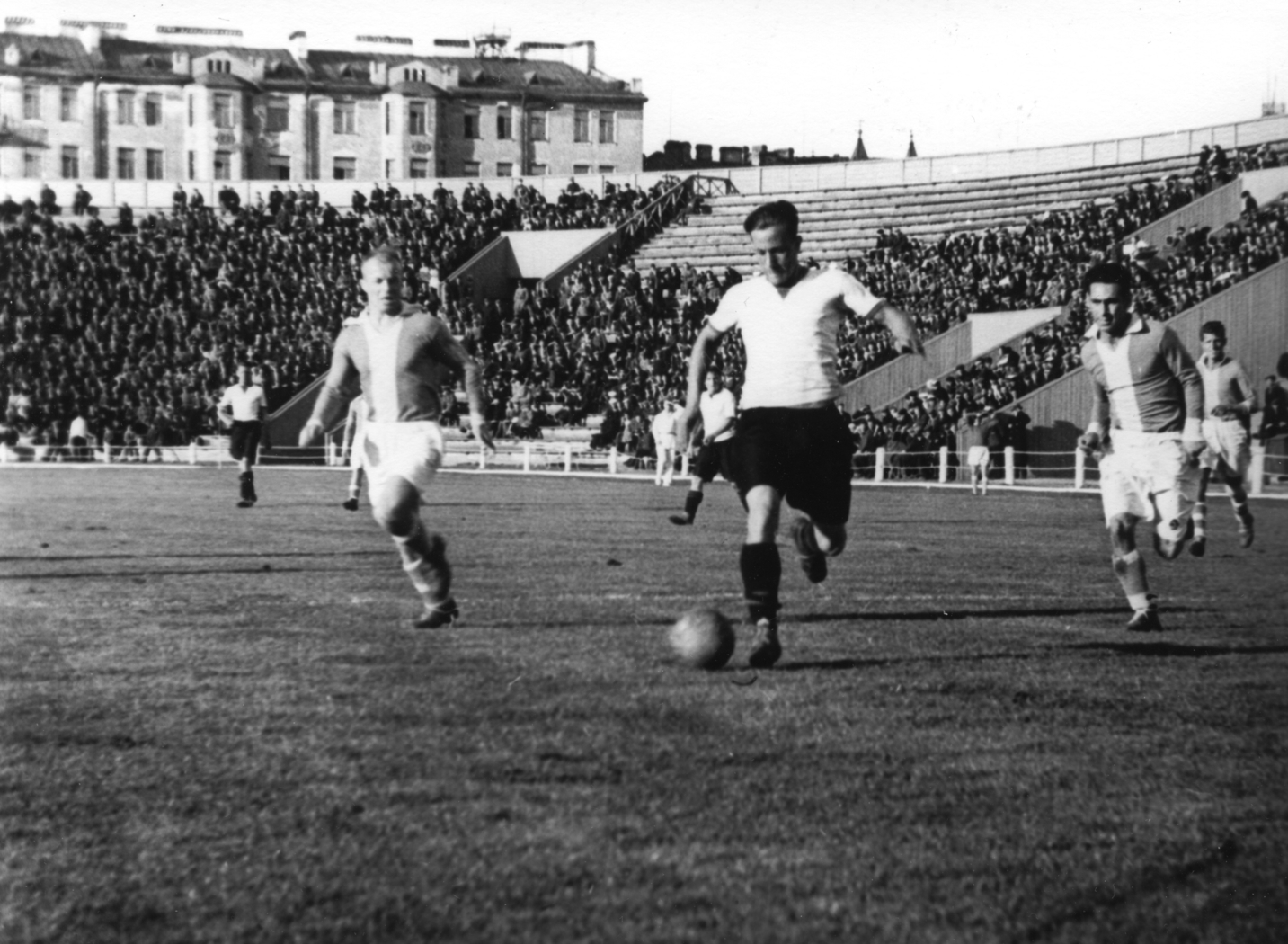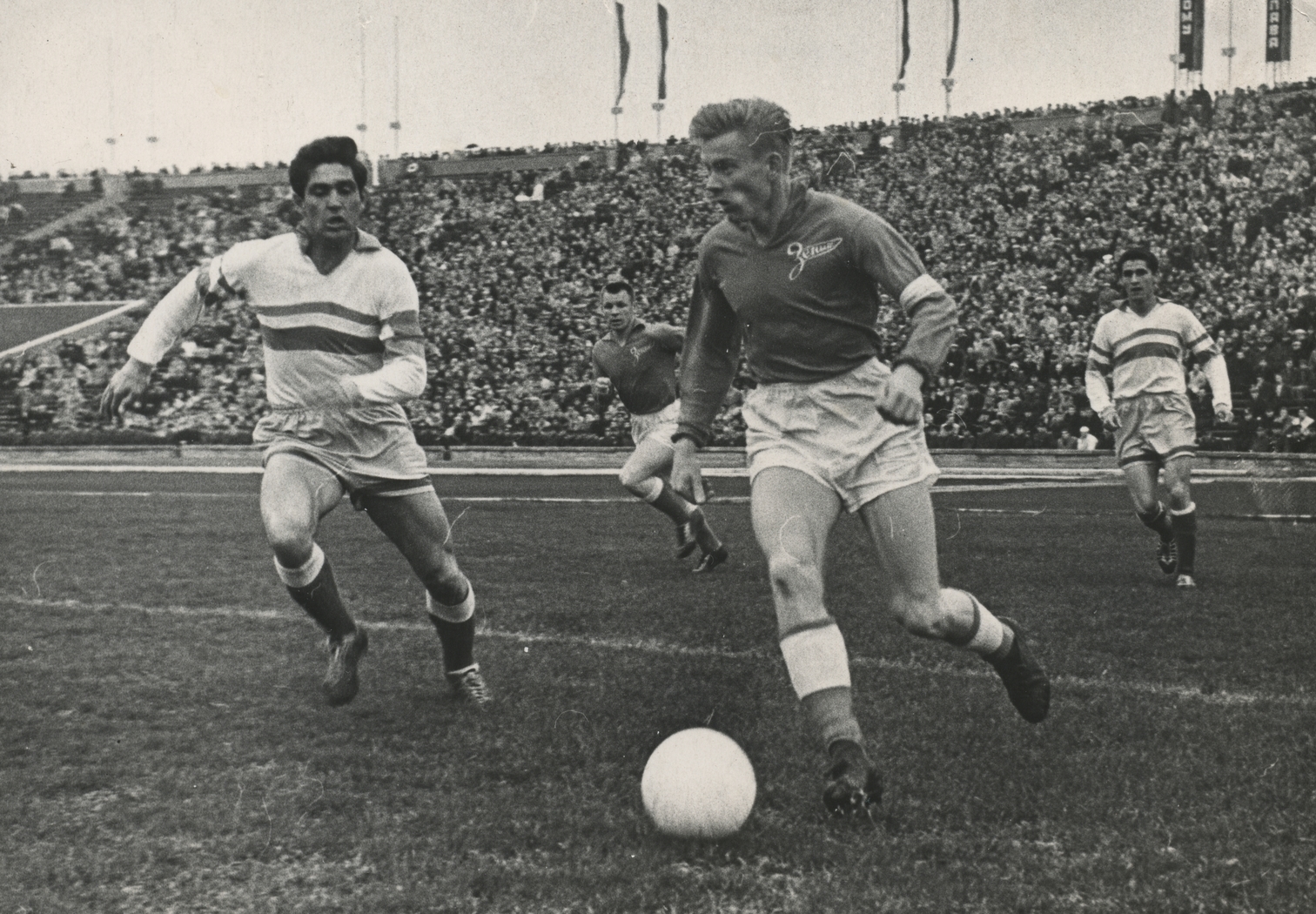 07.05.1963. СССР, Ленинград, стадион им. С.М. Кирова. Фото из личного архива советского футболиста, нападающего ФК «Зенит», Льва Бурчалкина. Футбольный матч ФК«Зенит»-ФК«Молдова» (Кишинев)(1:0). На снимке: Лев Бурчалкин, нападающий ФК «Зенит»(с мячом)Автор: ФК «Зенит» / ФК «Зенит»