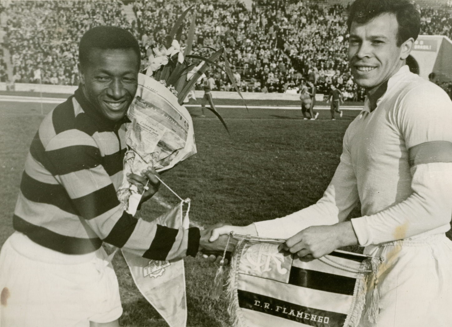 Россия, Санкт-Петербург. Репродукция фотографий из архива Юрия Лукосяка. Фото со встречи Зенит-Насьональ(Бразилия). 1969 г. П. Садырин и Эмилио Альварес.Автор: коллекция Юрия Лукосяка / ФК «Зенит»