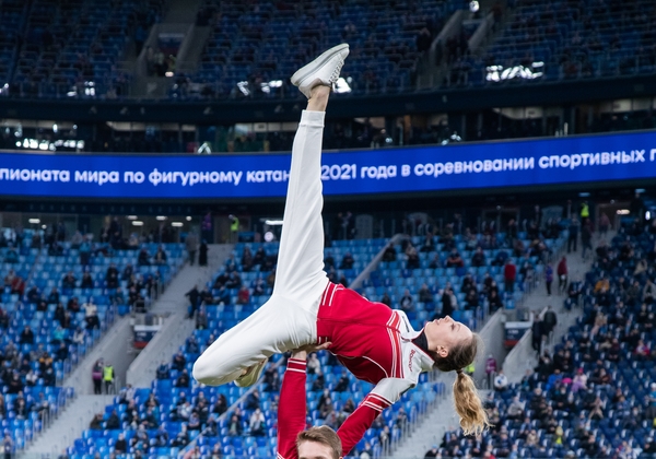 05.04.2021. Россия, Санкт-Петербург, «Газпром-Арена». Церемония чествования призеров чемпионата мира по фигурному катанию на матче «Зенит» — «Химки». На снимке: Анастасия Мишина и Александр Галлямов, чемпионы мира по фигурному катанию.Автор: Евгений Васильев / ФК «Зенит»
