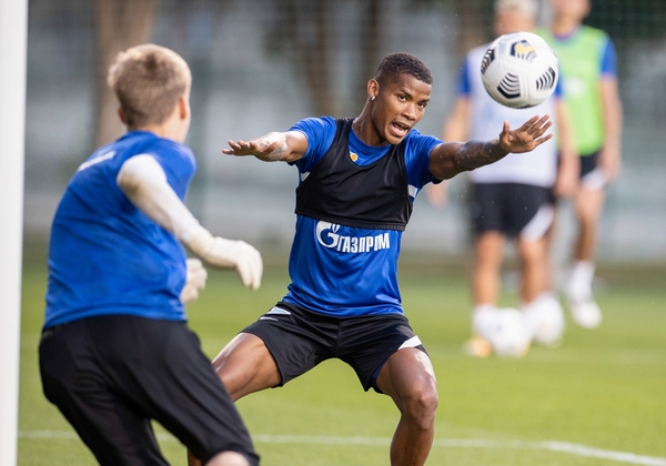 02.02.2021. Объединенные Арабские Эмираты, Дубай. Вторые «Газпром»-тренировочные сборы ФК «Зенит»: 02 февраля, вечерняя тренировка. На снимке: Вендел, полузащитник ФК «Зенит» и Себастьян Дриусси, нападающий ФК «Зенит».Автор: Вячеслав Евдокимов / ФК «Зенит»