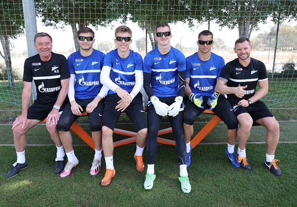 05.02.2021. Объединенные Арабские Эмираты, Дубай. Вторые «Газпром»-тренировочные сборы ФК «Зенит»: 05 февраля, утренняя тренировка. На снимке: Михаил Бирюков, тренер вратарей ФК «Зенит», Давид Бязров , вратарь ФК «Зенит», Даниил Одоевский, вратарь ФК «Зенит», Андрей Лунёв, вратарь ФК «Зенит», Михаил Кержаков, вратарь ФК «Зенит», Юрий Жевнов, тренер вратарей ФК «Зенит».Автор: Вячеслав Евдокимов / ФК «Зенит»