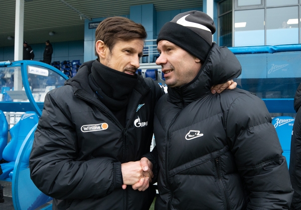 30.03.2021. Россия, Санкт-Петербург. Совместная тренировка основного и молодежного составов ФК «Зенит» на стадионе «Смена». На снимке: Сергей Семак, главный тренер ФК «Зенит», Константин Зырянов, главный тренер ФК «Зенит»-м.Автор: Анна Мейер / ФК «Зенит»