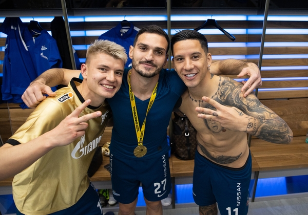 02.05.2021. Россия, Санкт-Петербург, «Газпром Арена». Команда празднует Чемпионство в раздевалке после матча Тинькофф Российская Премьер-Лига 2020/21, 28-й тур, «Зенит» — «Локомотив». На снимке: Андрей Мостовой, полузащитник ФК «Зенит», Магомед Оздоев, полузащитник ФК «Зенит», и Себастьян Дриусси, нападающий ФК «Зенит».Автор: Вячеслав Евдокимов / ФК «Зенит»