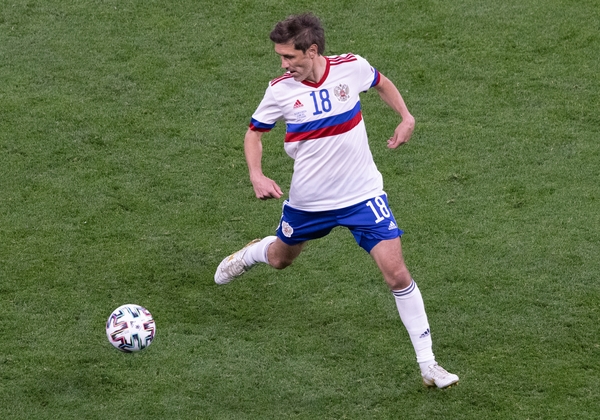 12.06.2021. Россия, Санкт-Петербург, стадион «Санкт-Петербург». Чемпионат Европы по футболу 2020, матч Бельгия — Россия. На снимке в белой форме: Юрий Жирков, защитник сборной России.Автор: Евгений Васильев / ФК «Зенит»