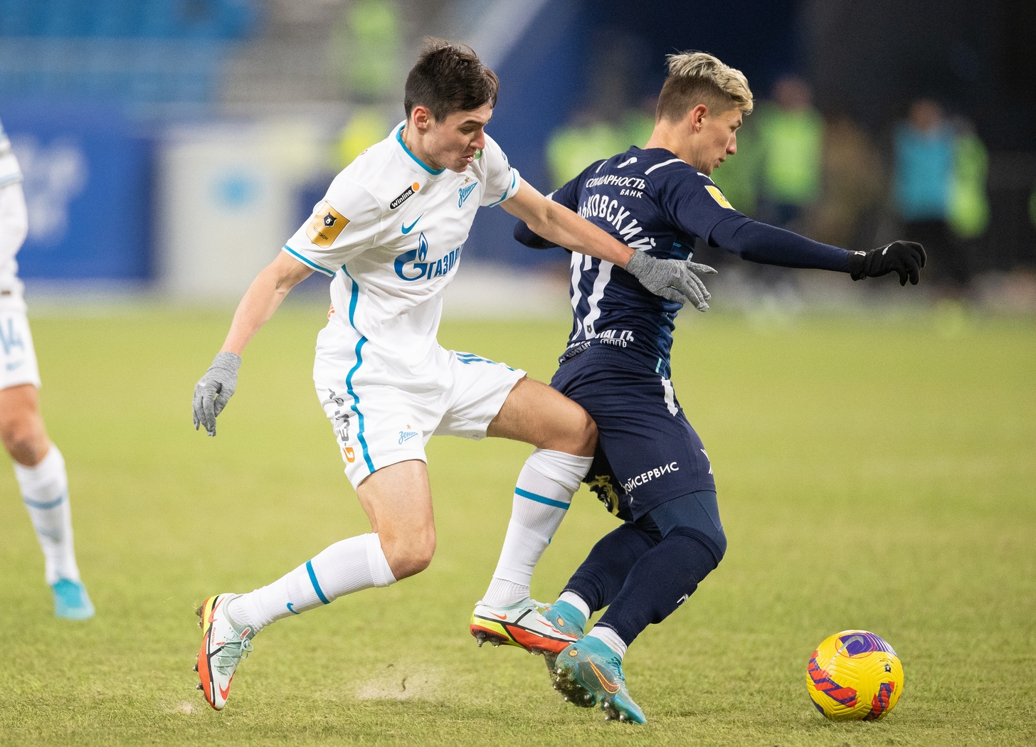 13.03.2022. Россия, Самара, «Солидарность Арена». Тинькофф Российская Премьер-Лига 2021/22, 21-й тур, «Крылья Советов» — «Зенит». На снимке в белой форме: Иван Сергеев, нападающий ФК «Зенит», Вячеслав Караваев, защитник ФК «Зенит».Автор: Вячеслав Евдокимов / ФК «Зенит»