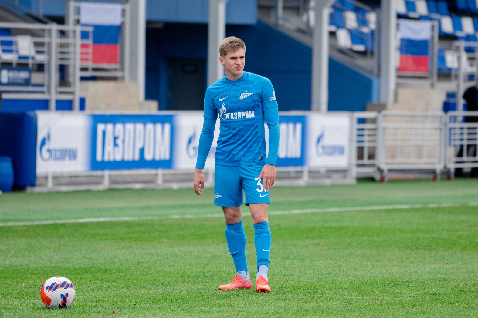 15.04.2022. Россия, Санкт-Петербург, «Газпром»-Академия ФК «Зенит». Молодежная Лига 2021/22, 23-й тур, «Зенит»-м — «Крылья Советов»-м. На снимке в синей форме: Владислав Саусь, полузащитник ФК «Зенит».Автор: Анна Мейер / ФК «Зенит»