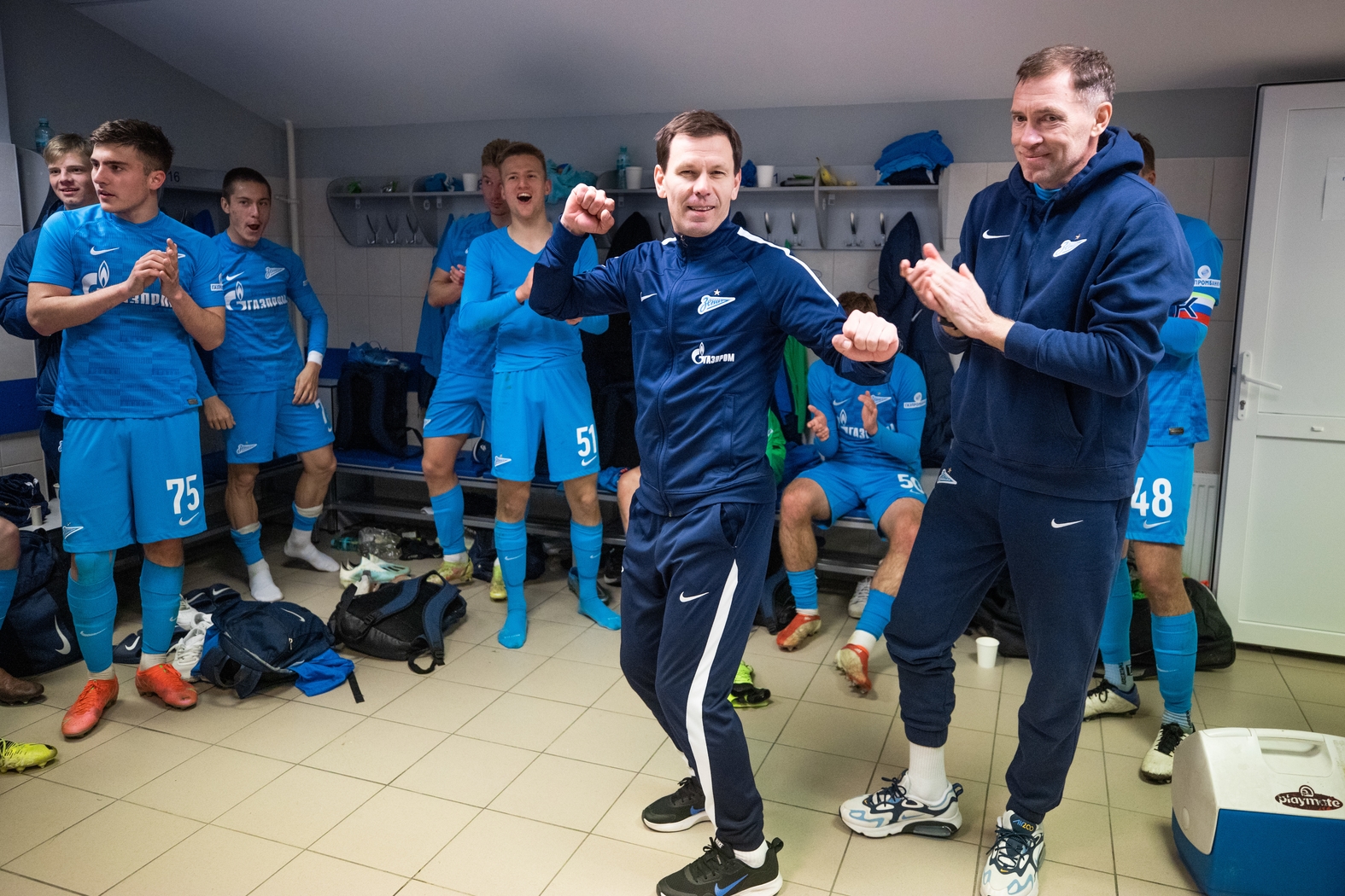 15.04.2022. Россия, Санкт-Петербург, «Газпром»-Академия ФК «Зенит». Молодежная Лига 2021/22, 23-й тур, «Зенит»-м — «Крылья Советов»-м. На снимке: Константин Лобов, тренер ФК «Зенит»-м, Тимур Абрамов, массажист ФК «Зенит», Аким Белохонов, нападающий ФК «Зенит», Матвей Трощенков, защитник ФК «Зенит», Валерий Мурзаков, защитник ФК «Зенит», Кирилл Хвастухин, нападающий ФК «Зенит», Евгений Пантелейчук, защитник ФК «Зенит», Илья Родионов, нападающий ФК «Зенит», Савва Котов, нападающий ФК «Зенит», Даниил Столяров, полузащитник ФК «Зенит», Елисей Емельянов, защитник ФК «Зенит», Руслан Хайлоев, полузащитник ФК «Зенит», Дмитрий Беляев, начальник команды ФК «Зенит»-м, Дмитрий Неклюдов, массажист ФК «Зенит»-м, Константин Зырянов, главный тренер ФК «Зенит»-м, Юрий Окрошидзе, тренер вратарей ФК «Зенит», Андрей Марьянов, защитник ФК «Зенит», Георгий Королев, вратарь ФК «Зенит», Рони Михайловский, нападающий ФК «Зенит», Юрий Васин, врач ФК «Зенит», Виктор Коврижников, защитник ФК «Зенит», Владислав Саусь, полузащитник ФК «Зенит», Арсений Зигангиров, защитник ФК «Зенит», Александр Емельянов, нападающий ФК «Зенит».Автор: Анна Мейер / ФК «Зенит»
