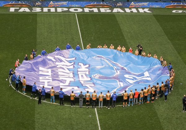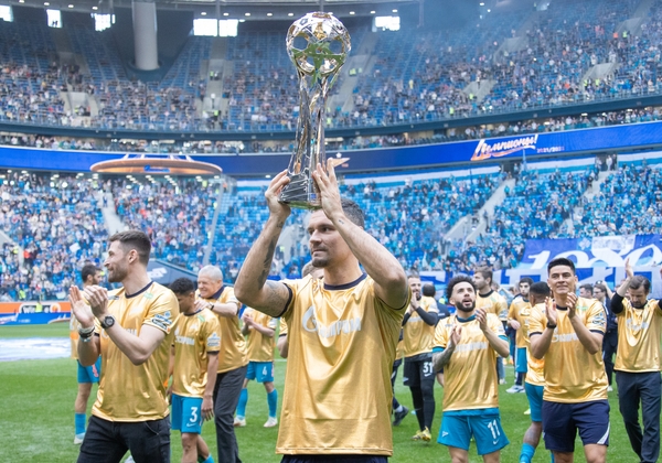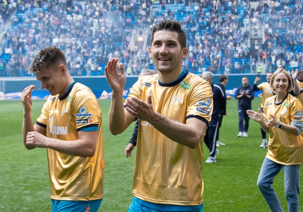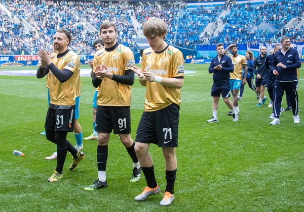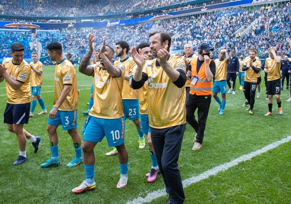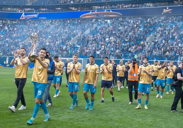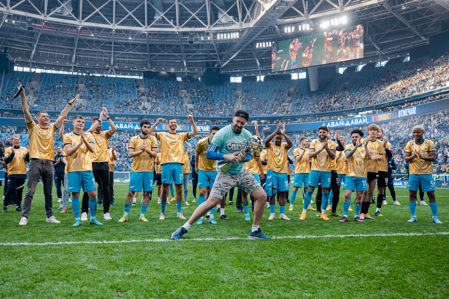 07.05.2022. Россия, Санкт-Петербург, «Газпром Арена». Празднование Чемпионства после матча Тинькофф Российской Премьер-Лиги 2021/22, 28-й тур, «Зенит» — «Химки». На снимке: Максим Гайдовский, видеоаналитик ФК «Зенит», Иван Карминати, тренер по физподготовке ФК «Зенит», Альберто Наварро, тренер по физподготовке ФК «Зенит», Михаил Гришин, главный врач ФК «Зенит», Михаил Бирюков, тренер вратарей ФК «Зенит», Игорь Симутенков, тренер ФК «Зенит», Юрий Жевнов, тренер вратарей ФК «Зенит», Вячеслав Караваев, защитник ФК «Зенит», Андрей Мостовой, полузащитник ФК «Зенит», Алексей Сутормин, полузащитник ФК «Зенит», Далер Кузяев, полузащитник ФК «Зенит», Деян Ловрен, защитник ФК «Зенит», Александр Попович, видео-аналитик ФК «Зенит», Александр Ерохин, полузащитник ФК «Зенит», Артём Дзюба, нападающий ФК «Зенит», Михаил Кержаков, вратарь ФК «Зенит», Константин Евланов, масажист ФК «Зенит», Станислав Крицюк, вратарь ФК «Зенит», Сергей Семак, главный тренер ФК «Зенит», Михаил Кизеев, вратарь ФК «Зенит», Нуралы Алип, защитник ФК «Зенит», Давид Бязров , вратарь ФК «Зенит», Данил Круговой, защитник ФК «Зенит», Арсен Адамов, защитник ФК «Зенит», Мария Бурова, тренер по физической подготовке ФК «Зенит», Вильям де Оливейра, тренер ФК «Зенит», Юри Алберто, нападающий ФК «Зенит», Дуглас Сантос, защитник ФК «Зенит», Даниил Одоевский, вратарь ФК «Зенит», Вендел, полузащитник ФК «Зенит», Павел Скорик, массажист ФК «Зенит», Андрей Цветков, массажист ФК «Зенит», Клаудиньо, полузащитник ФК «Зенит», Константин Евланов, масажист ФК «Зенит», Малком, полузащитник ФК «Зенит», Александр Медведев, Президент-генеральный директор ФК «Зенит», Вильмар Барриос, полузащитник ФК «Зенит», Иван Сергеев, нападающий ФК «Зенит», Владимир Хайтин, врач ФК «Зенит», Антон Костровский, администратор ФК «Зенит», Александр Рязанцев, массажист ФК «Зенит», Дмитрий Чистяков, защитник ФК «Зенит», Александр Анюков, тренер ФК «Зенит».Автор: Анна Мейер / ФК «Зенит»- Артём Дзюба