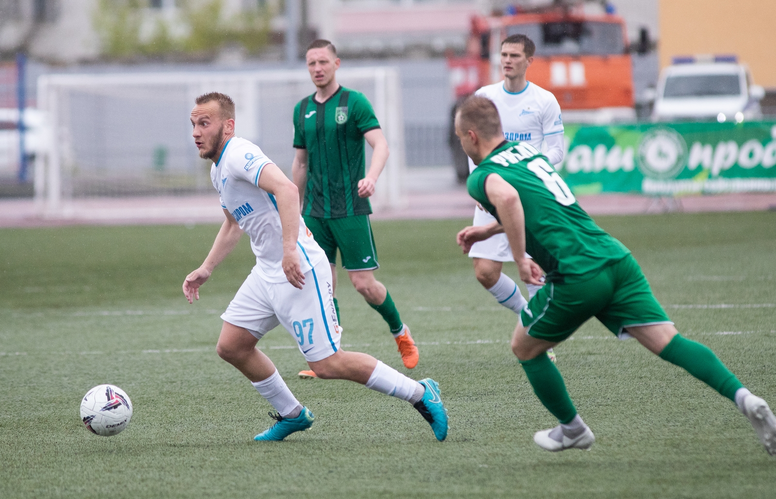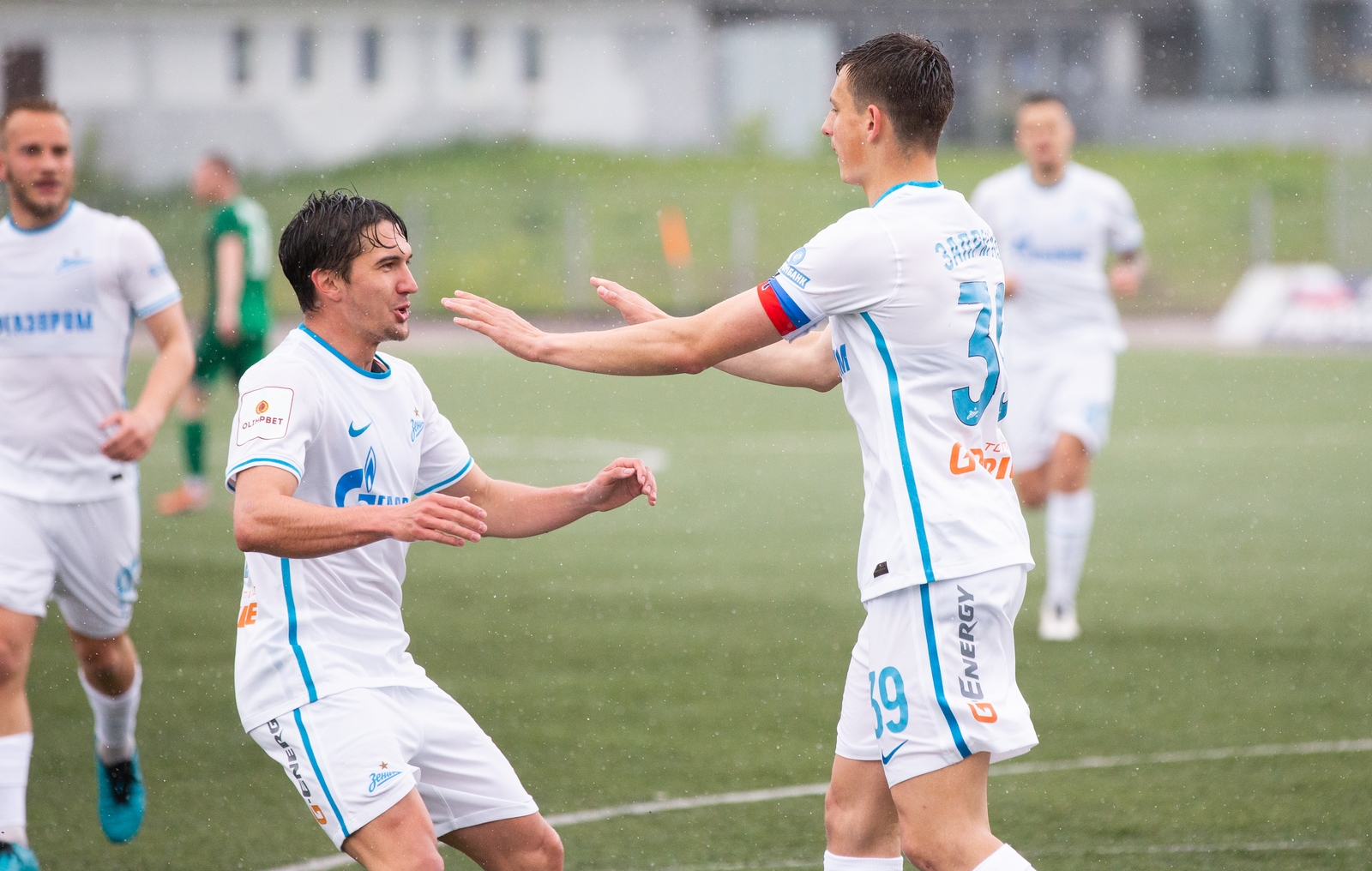 27.05.2022. Россия, Дзержинск, стадион «Химик». ОЛИМП — Первенство ФНЛ-2, 2021/22, 9-й тур, «Химик» — «Зенит»-2. На снимке в белой форме: Данила Варичев, защитник ФК «Зенит», Сергей Иванов, полузащитник ФК «Зенит», Василий Запрягаев, защитник ФК «Зенит», Александр Сандрачук, защитник ФК «Зенит», Никита Терещук, нападающий ФК «Зенит», Михаил Черномырдин, нападающий ФК «Зенит».Автор: Евгений Асмолов / ФК «Зенит»