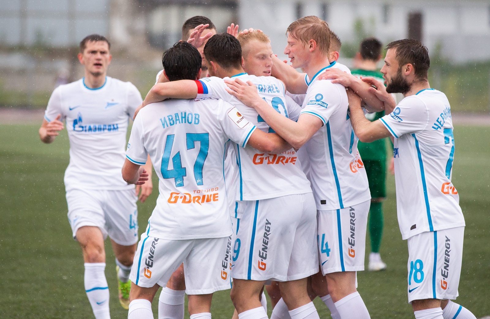 27.05.2022. Россия, Дзержинск, стадион «Химик». ОЛИМП — Первенство ФНЛ-2, 2021/22, 9-й тур, «Химик» — «Зенит»-2. На снимке в белой форме: Кирилл Фатеев, нападающий ФК «Зенит», Егор Шаповалов, нападающий ФК «Зенит», Илья Скроботов, защитник ФК «Зенит», Михаил Черномырдин, нападающий ФК «Зенит», Дмитрий Сергеев, полузащитник ФК «Зенит», Илья Москаленчик, защитник ФК «Зенит», Иван Андреев, полузащитник ФК «Зенит».Автор: Евгений Асмолов / ФК «Зенит»