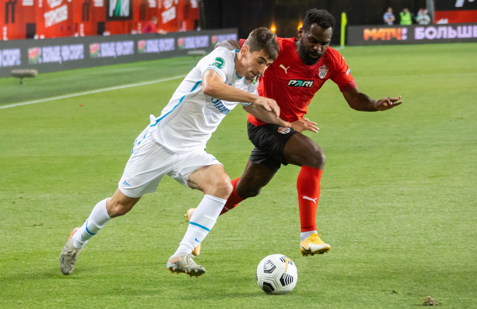 15.07.2022. Россия, Санкт-Петербург, «Арена Химки». Мир Российская Премьер-Лига 2022/23, 1-й тур, «Химки» — «Зенит». На снимке в белой форме: Вильмар Барриос, полузащитник ФК «Зенит», и Далер Кузяев, полузащитник ФК «Зенит».Автор: Вячеслав Евдокимов / ФК «Зенит»