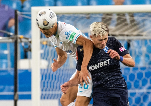 14.09.2022. Россия, Самара, «Солидарность Самара Арена». ФОНБЕТ Кубок России, 2022/23, Группа B, 2-й тур, «Крылья советов» — «Зенит». На снимке в белой форме: Иван Сергеев, нападающий ФК «Зенит», Данил Круговой, защитник ФК «Зенит».Автор: Вячеслав Евдокимов / ФК «Зенит»